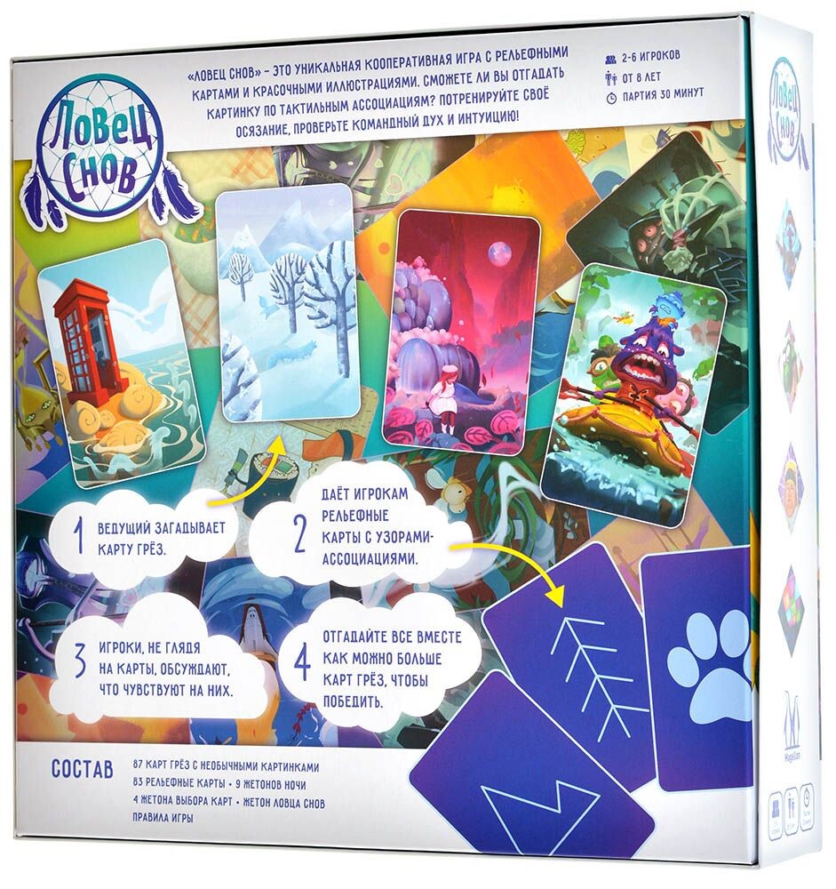 В коробке вас ждут красочные карты сюжетов и специальные карты с рельефными изображениями. Один из игроков станет ведущим и загадает один сюжет из предложенных. Для того чтобы участники догадались, ведущий даст рельефные карты, которые игроки будут трогать и по тактильным ощущениям определить, что за подсказки перед ними. Сравните свои ощущения и попробуйте составить общую картину, чтобы по итогу догадаться. Отгадывая правильно, вы получаете специальный победный жетон. Наберите наибольшее количество жетонов и станьте победителем!