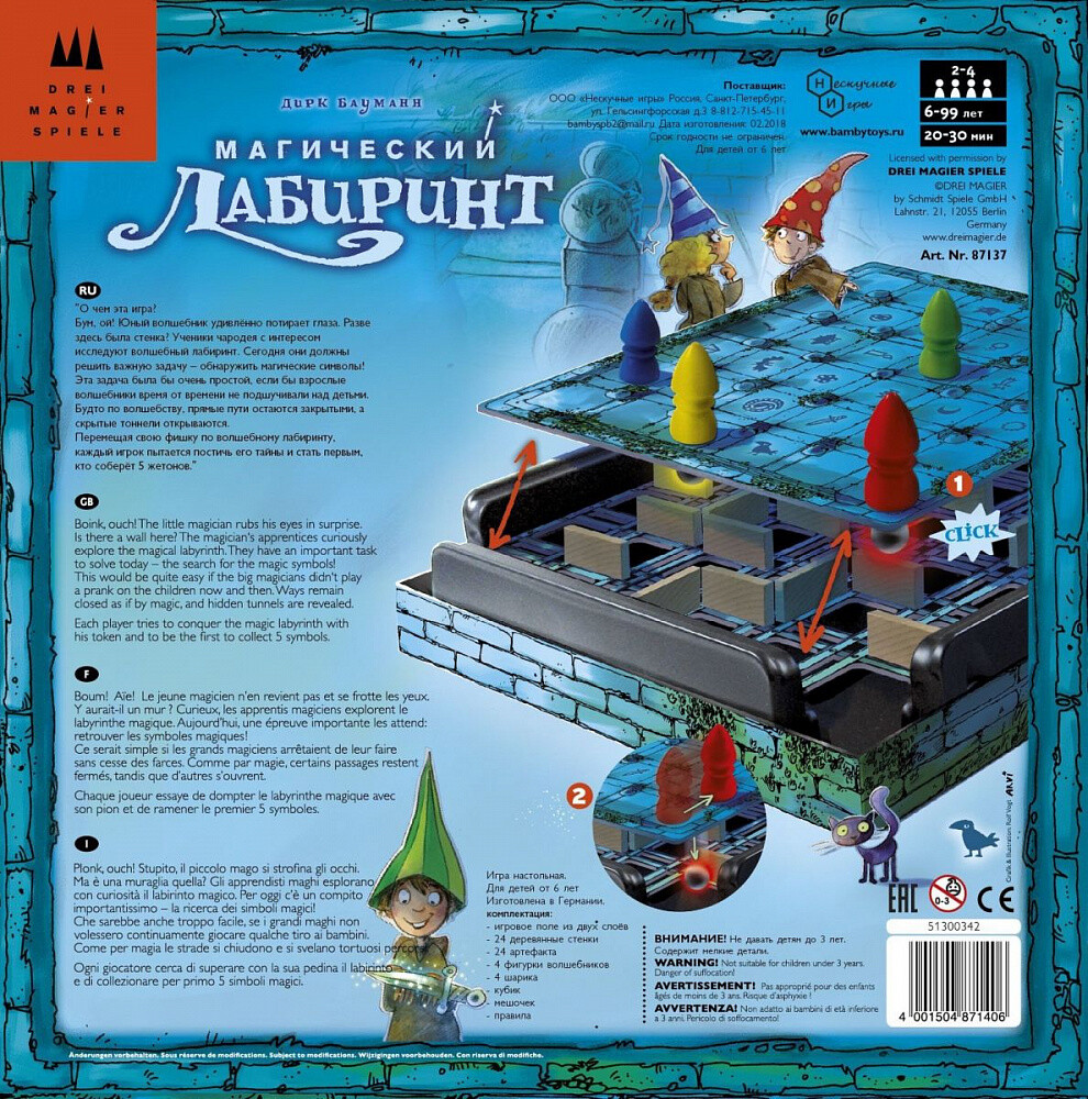 Чародеи, подходите! Вам предстоит непростое задание - кто первым добудет пять артефактов в лабиринте? Звучит просто, но не спешите радоваться, - этот лабиринт не так уж прост! В данной красочной настольной соревновательной игре участники будут перемещаться по лабиринту с невидимыми стенами. Количество шагов каждого чародея будет определяться броском кубика, а направление движения может быть любое, но не по диагонали. Каждому следует быть крайне осторожным, ведь если чародей наткнется на невидимую стену, ему придется начинать с самого начала. Внимательно следя за происходящим на поле, вы будете запоминать расположение стен и постепенно найдете выгодный путь для победы. Сможете ли вы опередить остальных и стать лучшим волшебником?