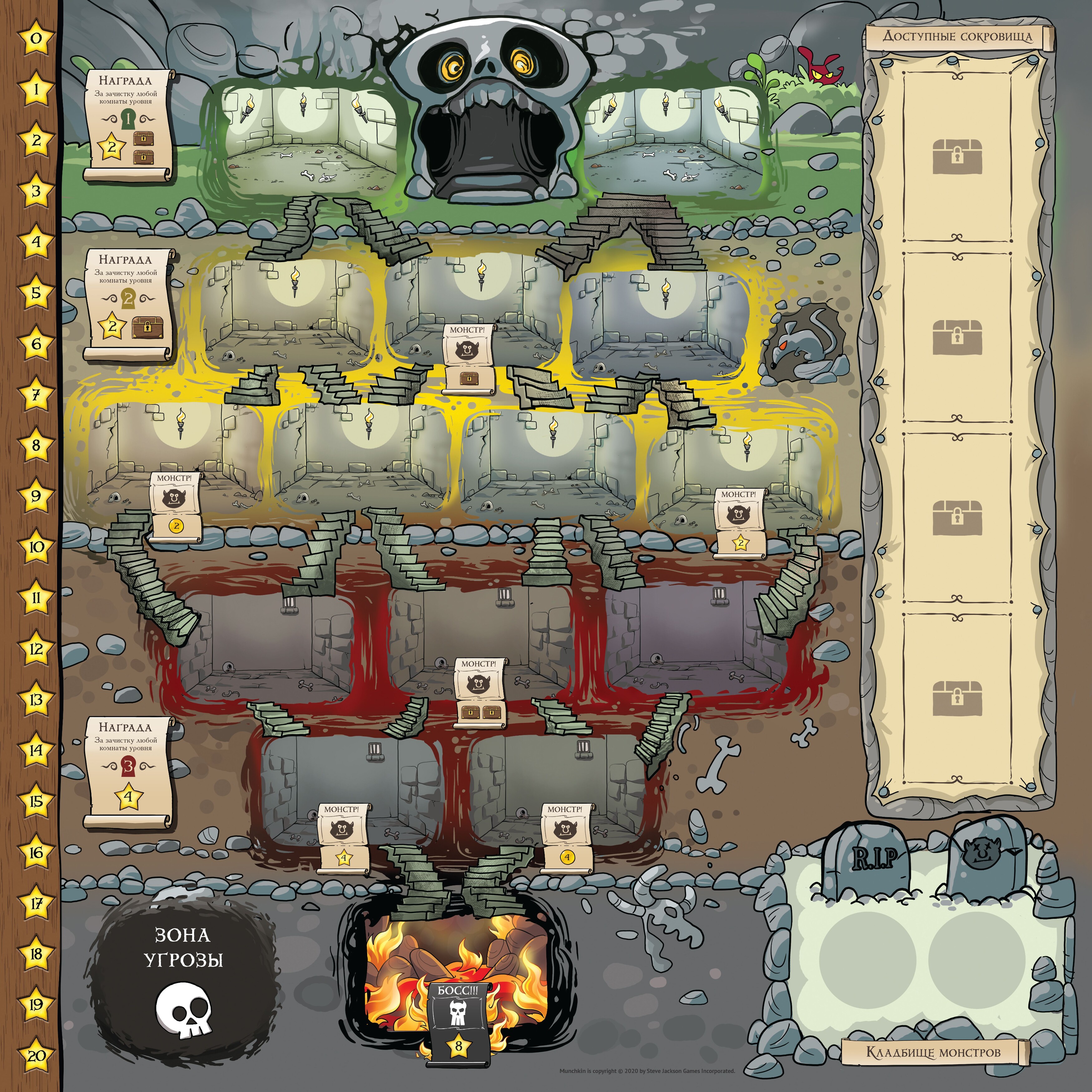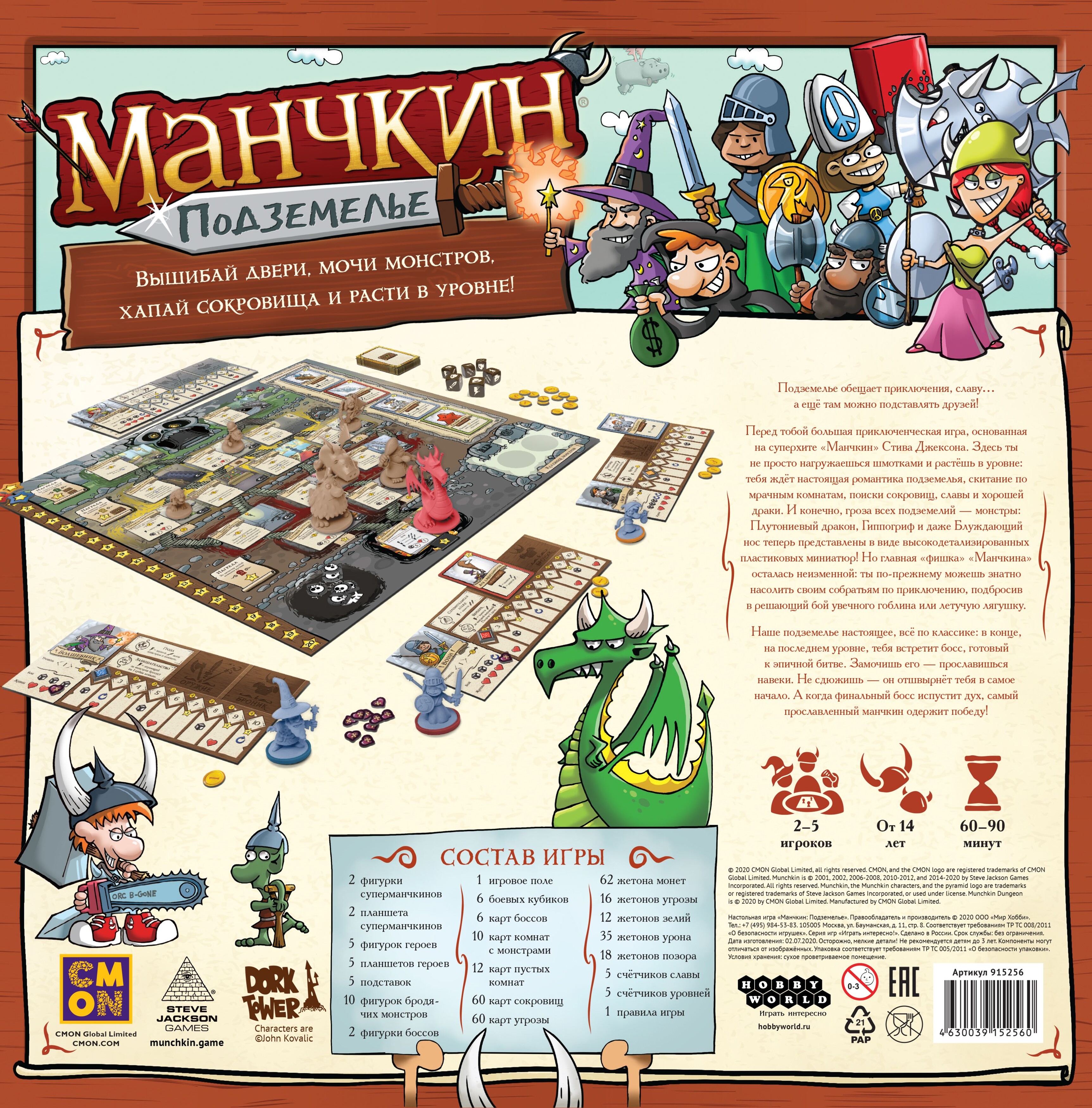 Герои, пришло время отправляться в опасное приключение! В данной самостоятельной версии популярной игры "Манчкин" игроки возьмут на себя роль отважных героев, которым предстоит отправиться в подземелье, полное сокровищ и монстров. С помощью карт вы сможете пройти три уровня комнат и встретиться с опасным боссом, поджидающим приключенцев. Комбинации комнат и боссов великое множество, поэтому каждое прохождение будет в определенной степени уникальным. Выбрав комнату, вы можете зачистить ее для получения полезных предметов, но будьте осторожны, ведь другой игрок может помешать вам и добавить дополнительных проблем. Участник, набравший двадцать очков славы за победу над монстрами, или три раза победивший босса, станет победителем! Перемещайте пластиковые фигурки персонажей по комнатам, боритесь с монстрами с помощью кубиков, замедляйте соперников и станьте лучшим в этом подземелье!