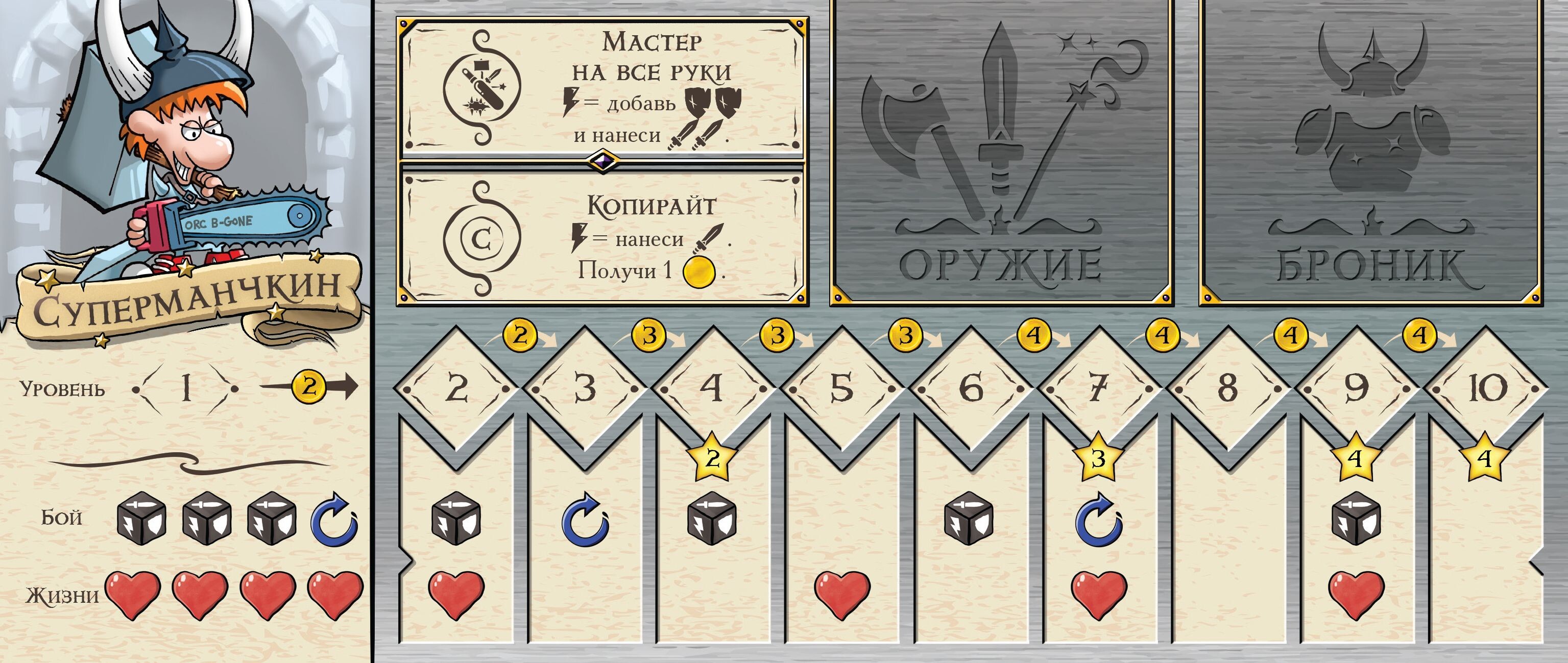 В данной самостоятельной версии популярной игры "Манчкин" игроки возьмут на себя роль отважных героев, которым предстоит отправиться в подземелье, полное сокровищ и монстров. С помощью карт вы сможете пройти три уровня комнат и встретиться с опасным боссом, поджидающим приключенцев. Комбинации комнат и боссов великое множество, поэтому каждое прохождение будет в определенной степени уникальным. Выбрав комнату, вы можете зачистить ее для получения полезных предметов, но будьте осторожны, ведь другой игрок может помешать вам и добавить дополнительных проблем. Участник, набравший двадцать очков славы за победу над монстрами, или три раза победивший босса, станет победителем!