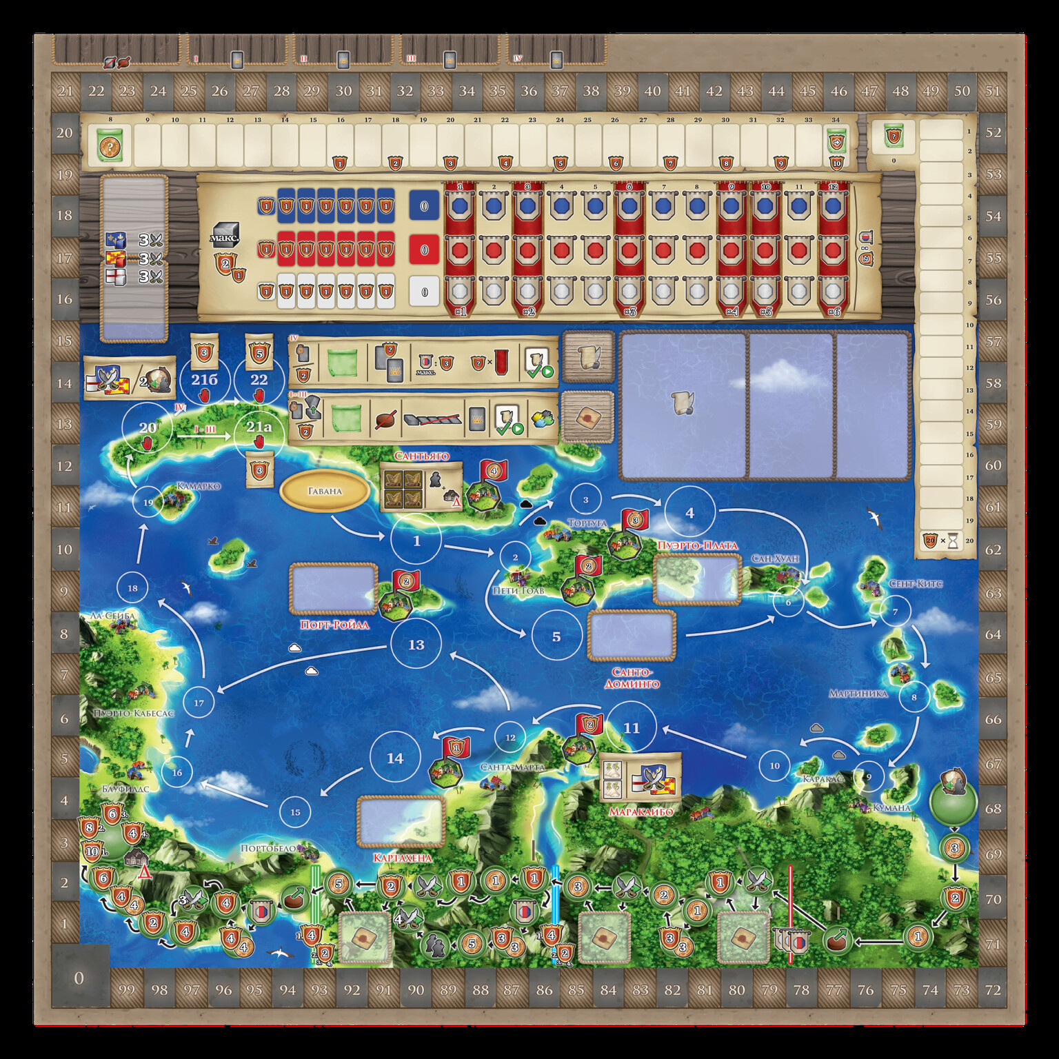 Игрок, набравший наибольшее количество победных очков, станет лучшим мореплавателем и победителем! Не забудьте надеть треуголку и хватайтесь за штурвал, - Карибы будут покорены!