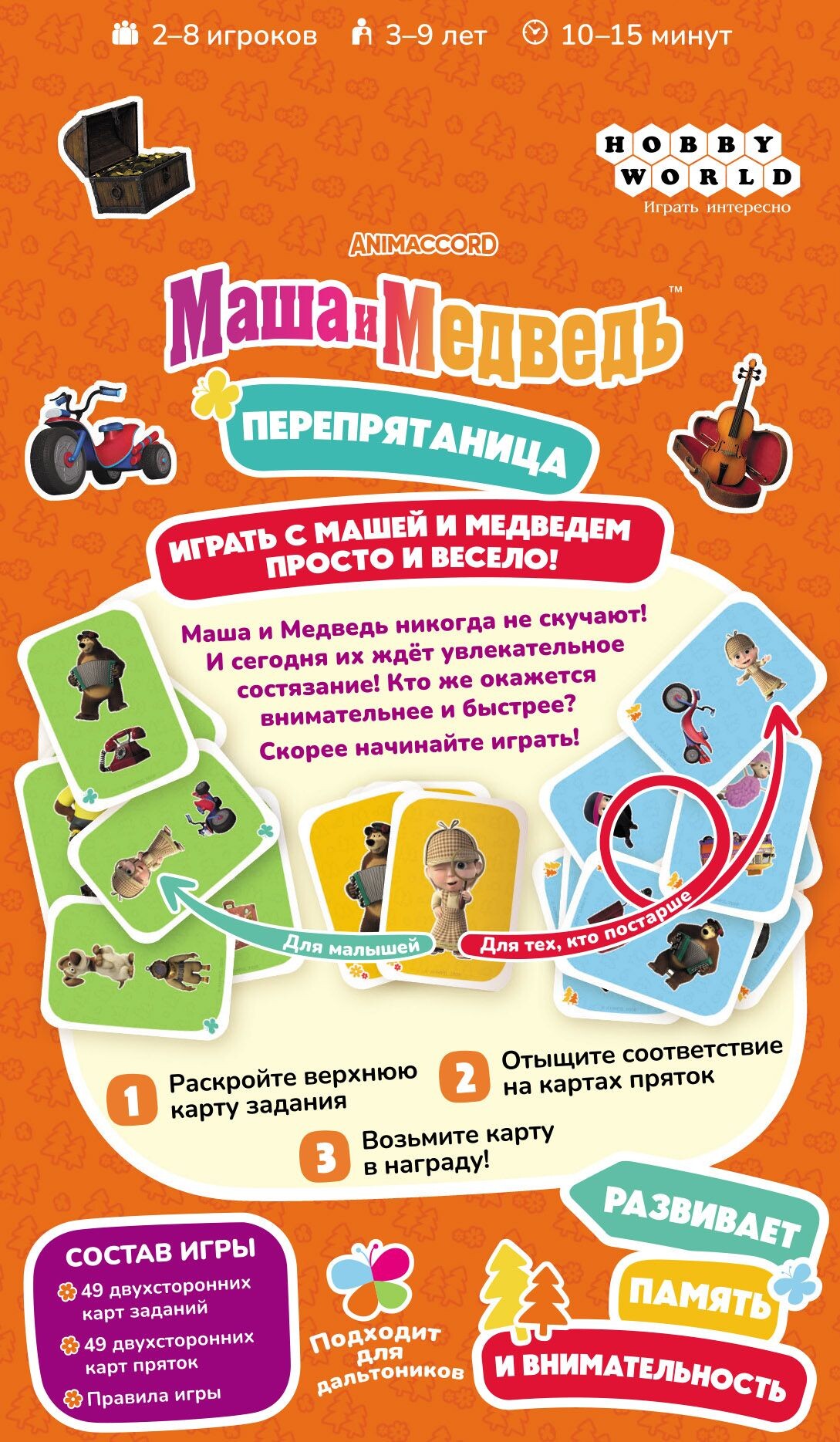 Внутри коробки вас ждет множество карт с персонажами и предметами из популярного мультсериала. Карты заданий в центре стола переворачиваются по одной, и вам нужно быстро найти одинаковую иллюстрацию. При этом, она может немного отличаться по размеру, быть под разным углом и пребывать в различных позах. По итогу победит тот, кто соберет наибольшее количество карт. Попробуйте опередить остальных и стать победителем!