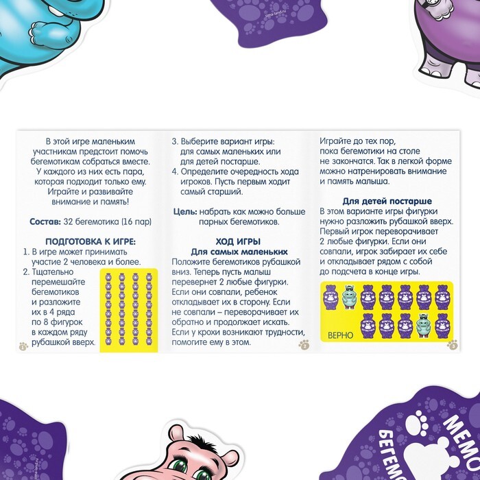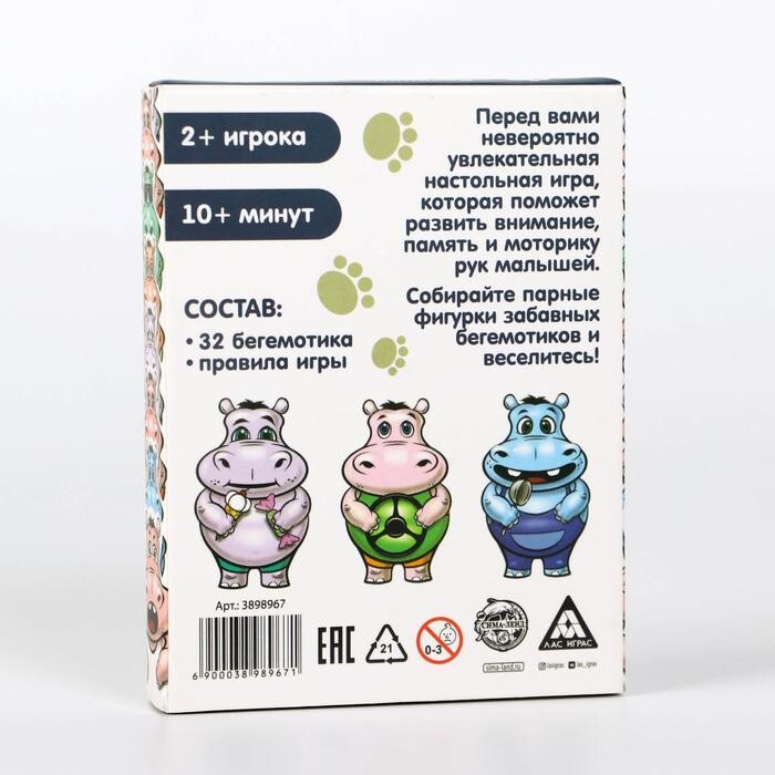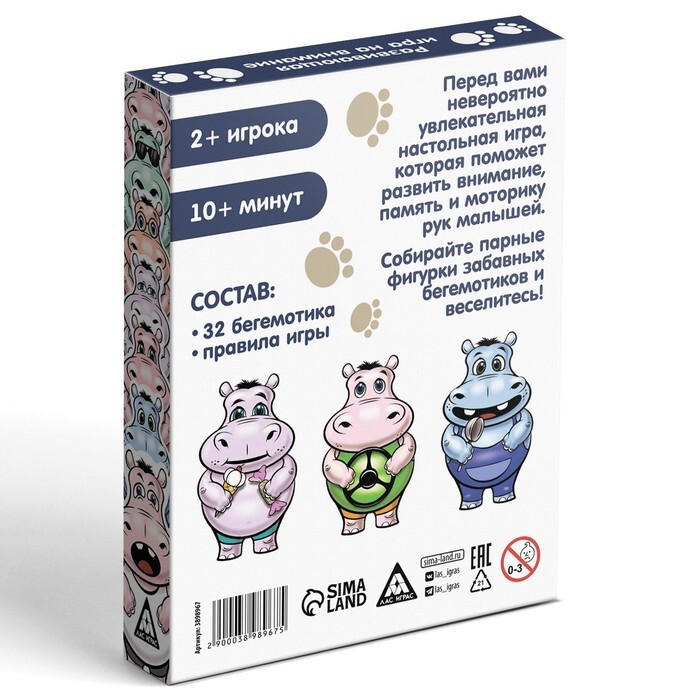 Данная игра поможет малышам развить память и внимательность! Доставайте карточки милых бегемотиков и выкладывайте их на стол рубашкой вверх. По очереди переворачивайте две любые карты. Если изображения на них совпали, забирайте пару себе. Победит тот, кто сможет набрать наибольшее количество парных карт!