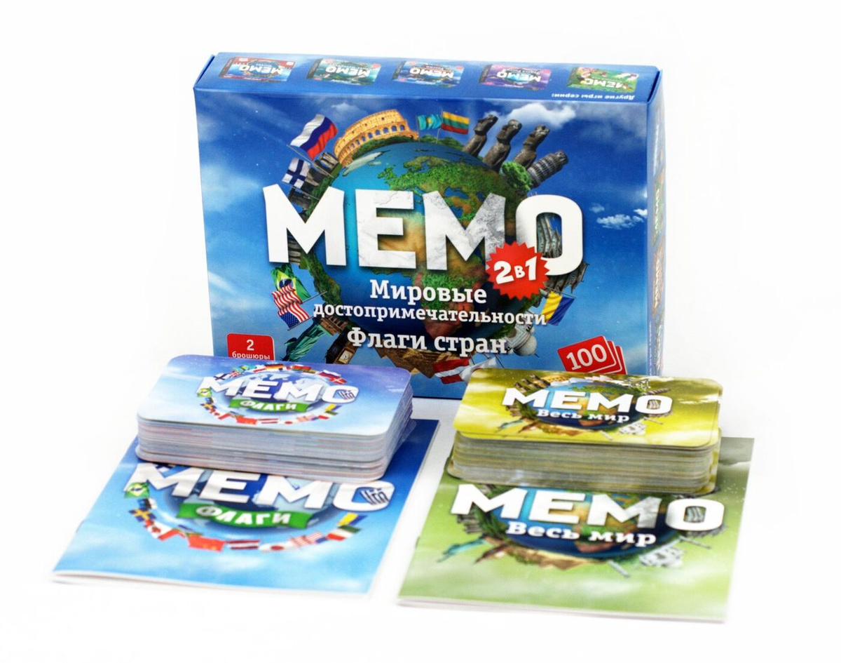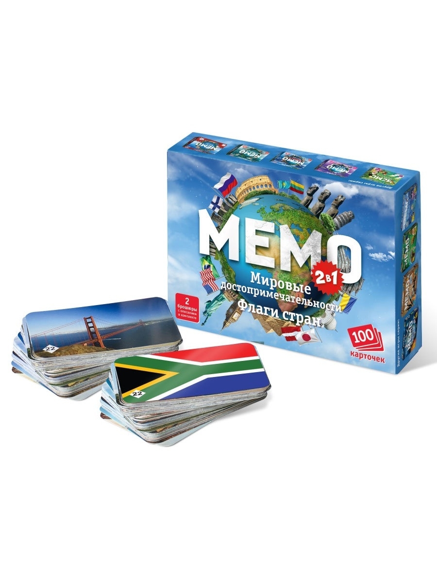 Данная игра содержит сто карточек с яркими изображениями различных флагов и достопримечательностей со всего света. Выложите их взакрытую, а затем начните игру. Каждый участник берет две любых карты и переворачивает их. Если изображения совпадают, он получает парные карты себе, но если иллюстрации отличаются, карты возвращаются на место взакрытую. Игрок, который сможет собрать как можно больше пар, станет победителем!