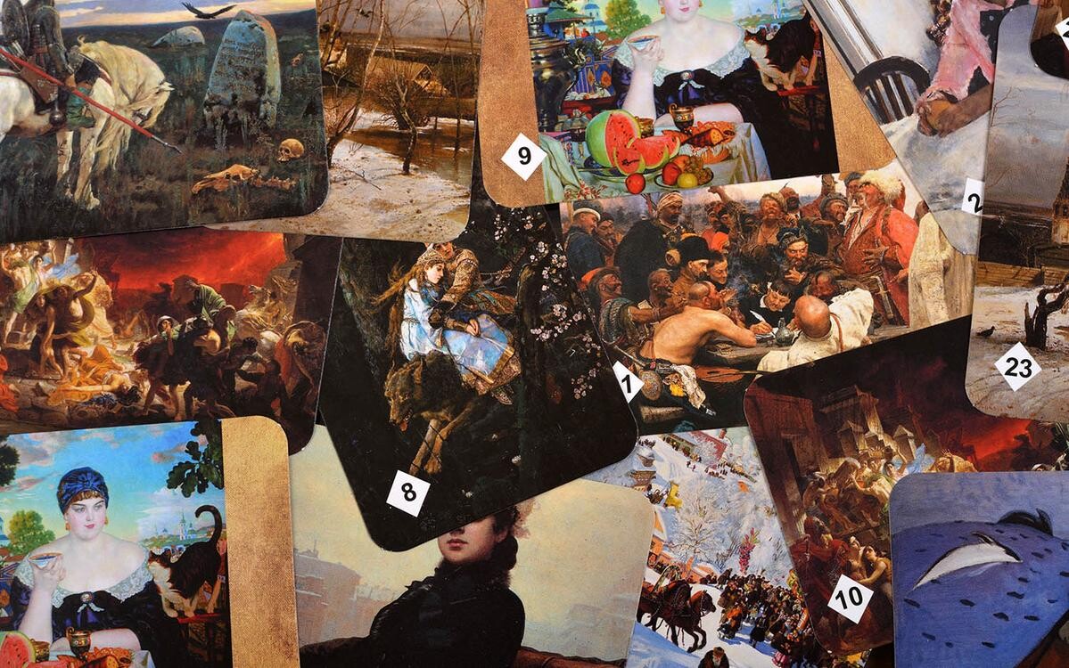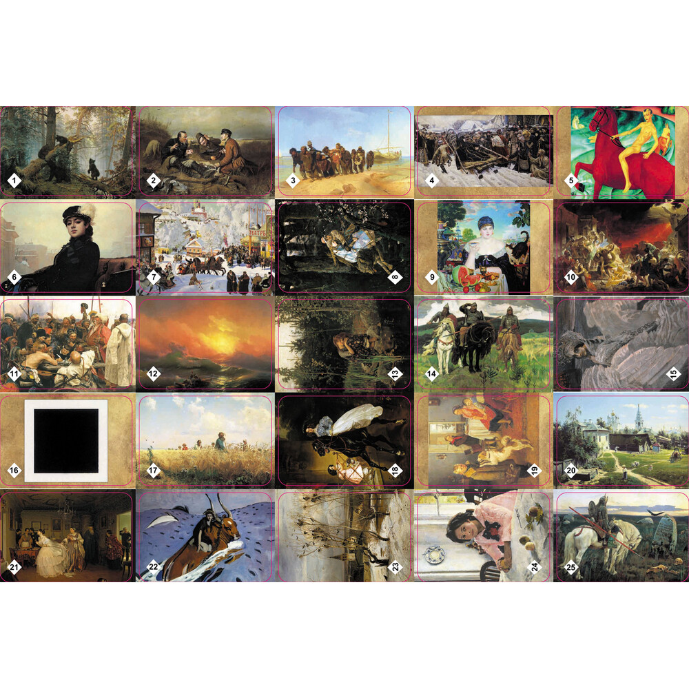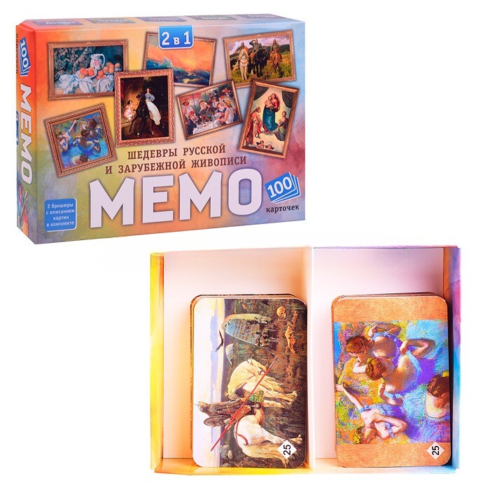 В небольшой коробке вас ждут целых сто карт с парными красивейшими иллюстрациями картин русских художников и художников других стран. Правила соревнования крайне просты - положив карты рубашкой вверх, вам необходимо искать соответствия, в свой ход перевернув две любых карты. Если изображения совпадут, вы получаете их себе, а если нет, - кладете обратно. Кто найдет больше пар, тот и станет победителем!
