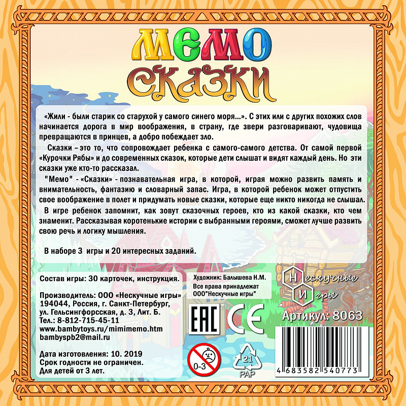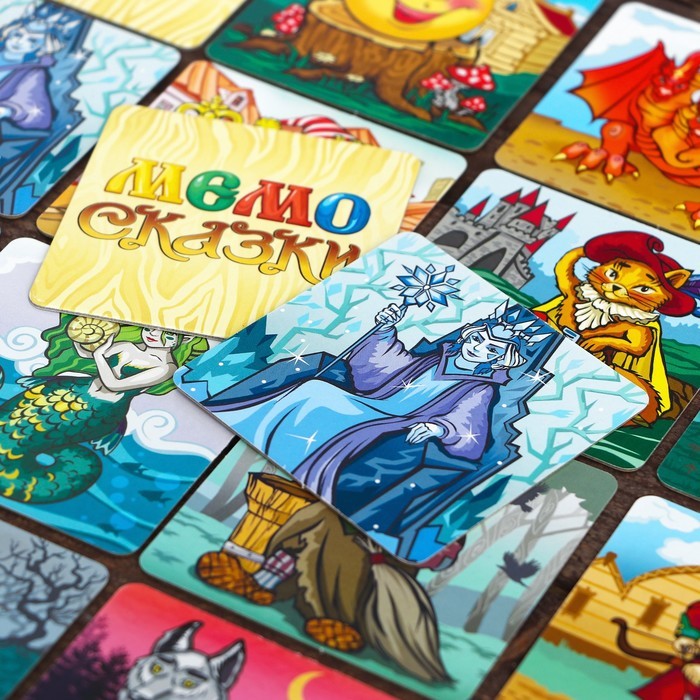 Настольная игра "Мемо. Сказки" предлагает ребенку самому придумывать сказки со случайно выбранными героями. Эта игра поможет развить память и внимательность. Необходимо собрать как можно больше пар карточек. Разложите карточки на столе картинками вниз.
