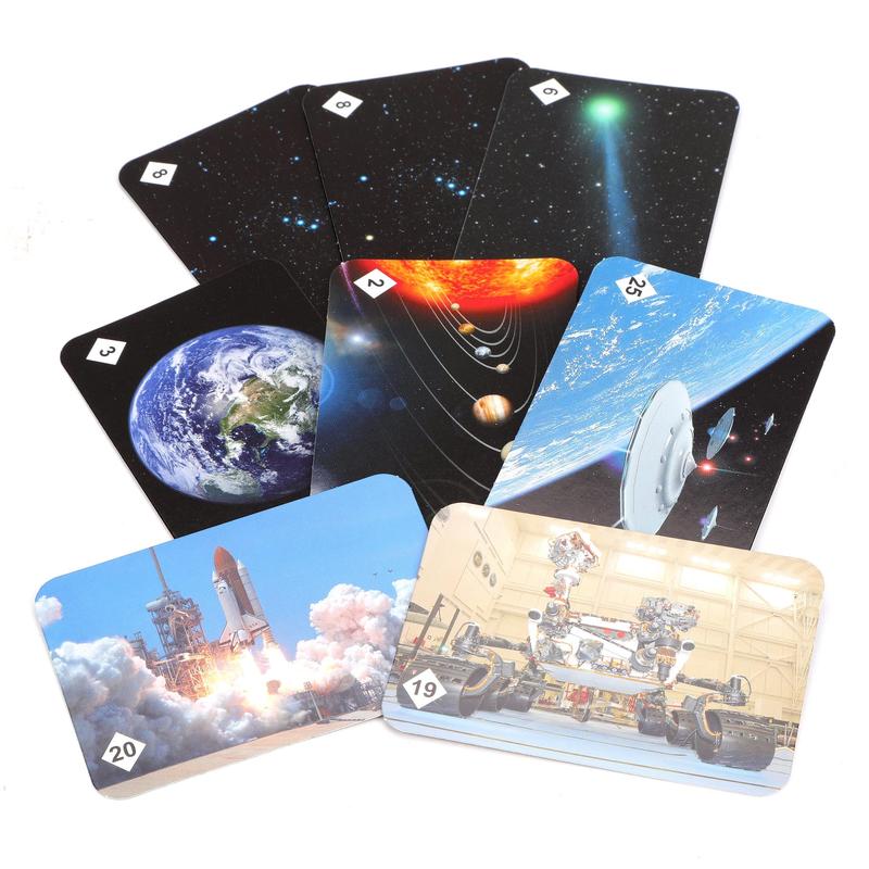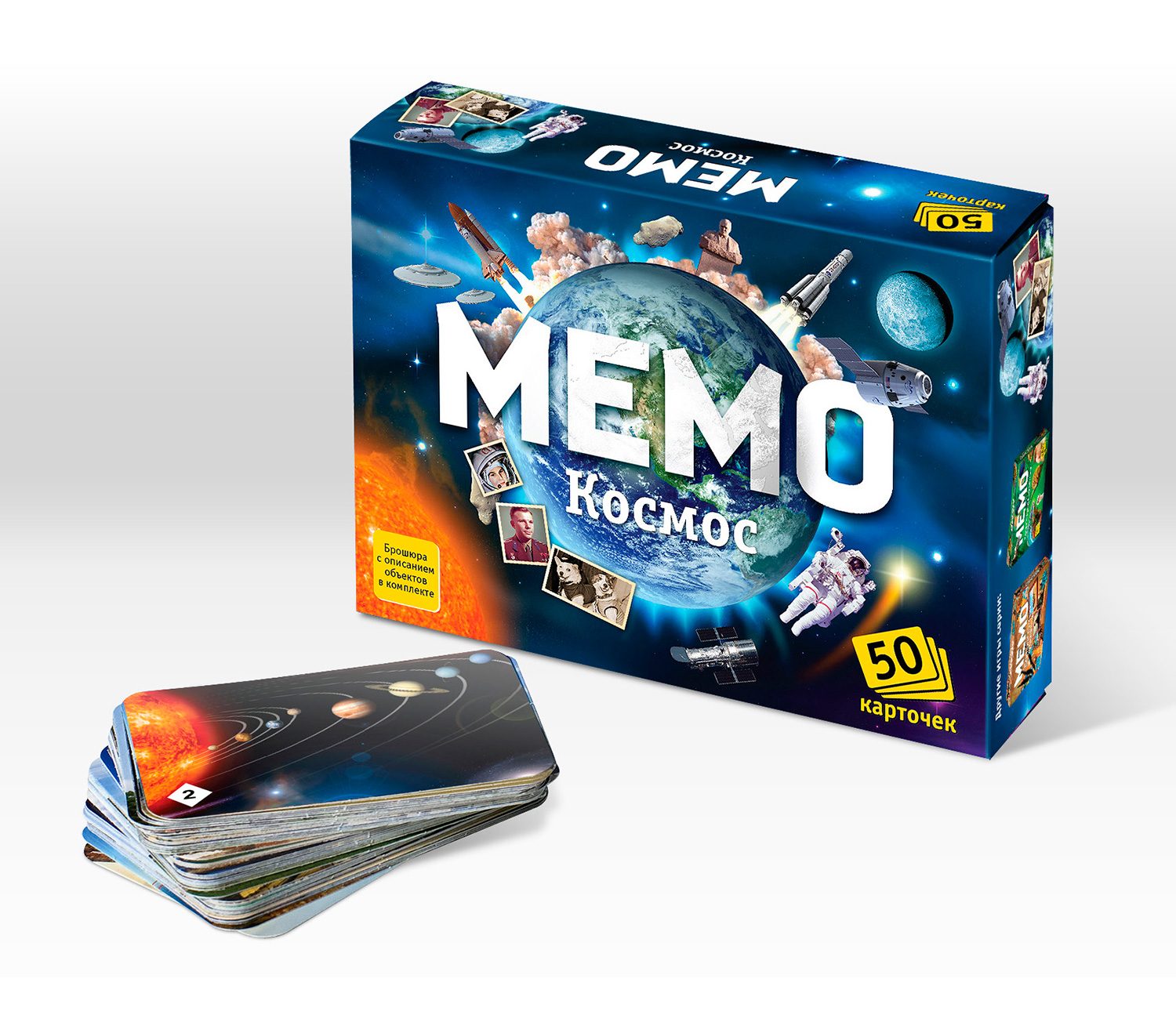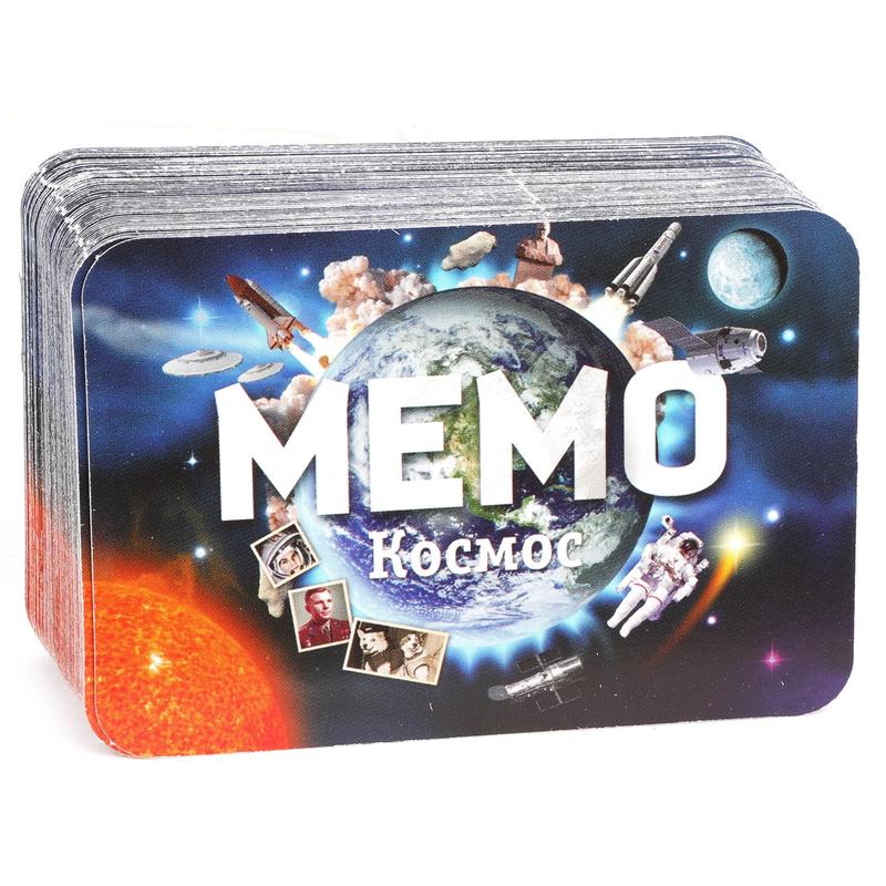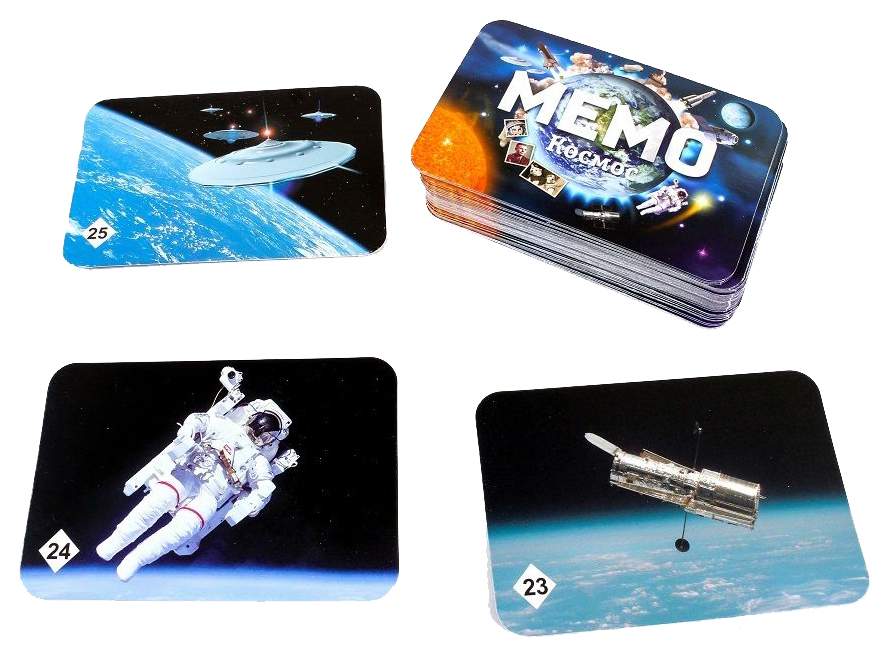 Данный выпуск серии "Мемо" представлен космической тематикой, поэтому внутри коробки вы найдете множество иллюстраций с известными космонавтами, летающими ракетами и луноходами. Выложите все эти карты на стол взакрытую, а затем по очереди переворачивайте две любые карты в надежде найти парный рисунок. Кто соберет больше парных иллюстраций, тот и победит!