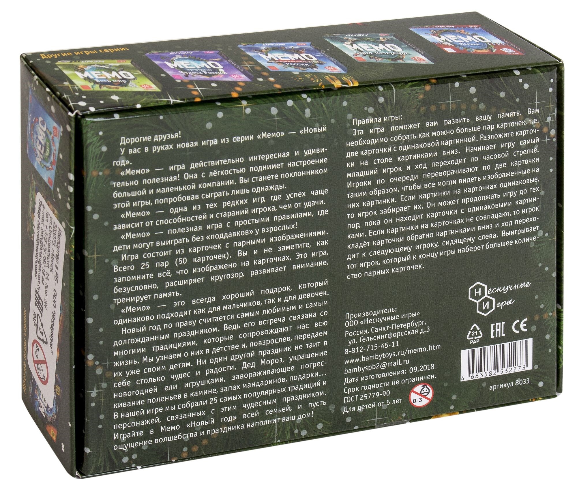Веселое соревнование проверит вашу память. Игрокам предстоит выложить пятьдесят карточек рубашкой вверх, после чего в свой ход открыть две любые. Если изображения на них совпадают, игрок получает пару себе, а если совпадений нет, - карты кладутся обратно. Таким образом тот, кто наберет наибольшее количество парных карт, станет победителем. Как вы понимаете, тематикой данного выпуска стал многими любимы праздник - Новый Год. Иллюстрации мишуры и елки, праздничного стола и прочих атрибутов ждут вас на картах. Уже чувствуете запах мандаринов?