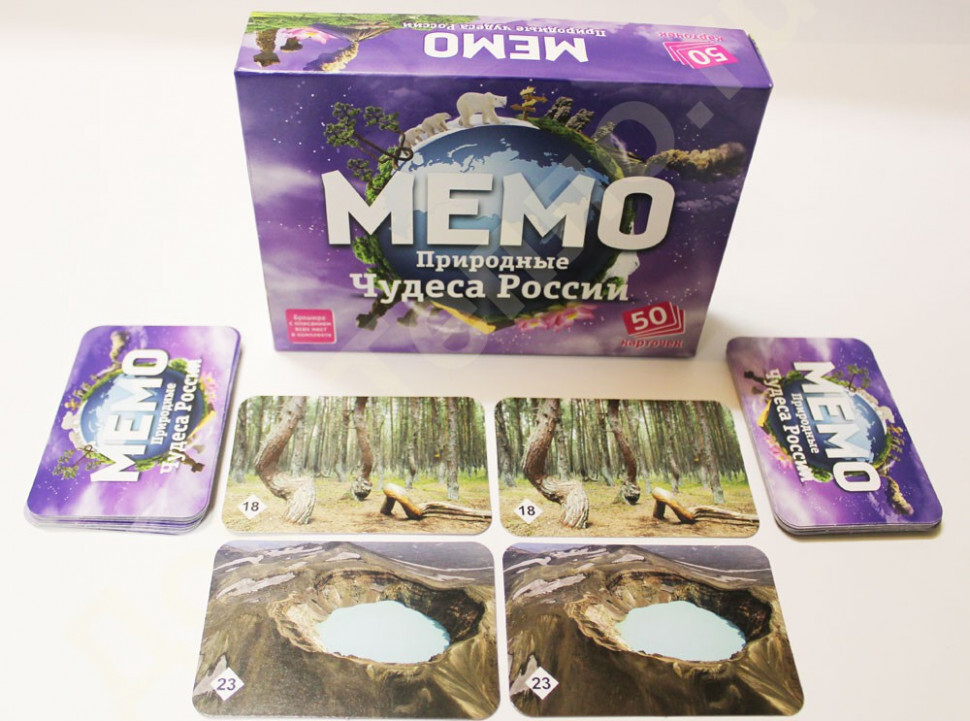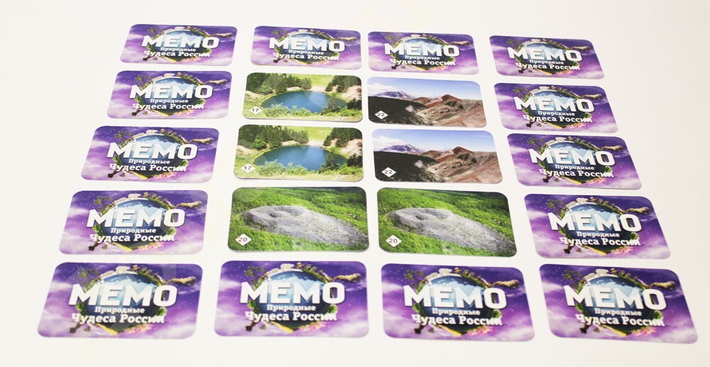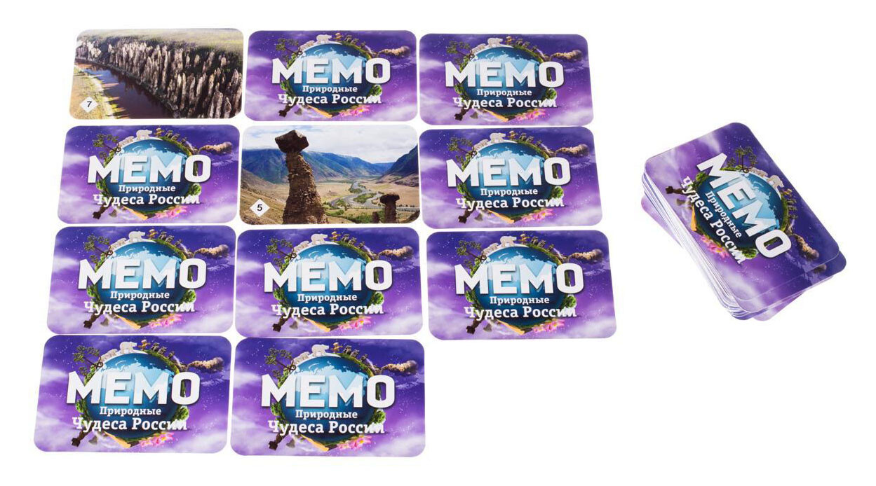 Перед вами часть знаменитой серии "Мемо", которая на сей раз предложит посоревноваться в поиске парных карт с иллюстрациями российских природных чудес. Ищите парные картинки с озером Байкал, Долиной гейзеров и Кунгурской пещерой. Кто соберет больше парных карт, тот и станет победителем!