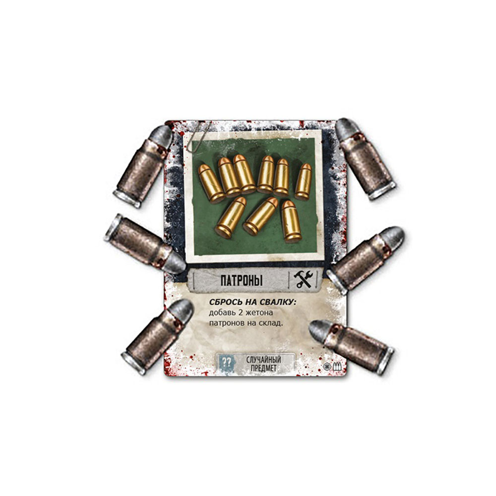 20 карт «перекрёстков», 11 карт кризисов, 4 карты основных целей, 10 планшетов игроков, 15 карт выживших, 43 карты предметов, 10 карт тактики, 8 карт секретных целей одинокого волка, 14 карт миссий одинокого волка, планшет логова одинокого волка, 33 жетона патронов, 1 счётчик боевой силы, 2 жетона для счетчиков, 15 фигурок выживших, 15 пластиковых подставок для фигурок, песочные часы, буклет с правилами, 2 боевых кубика.