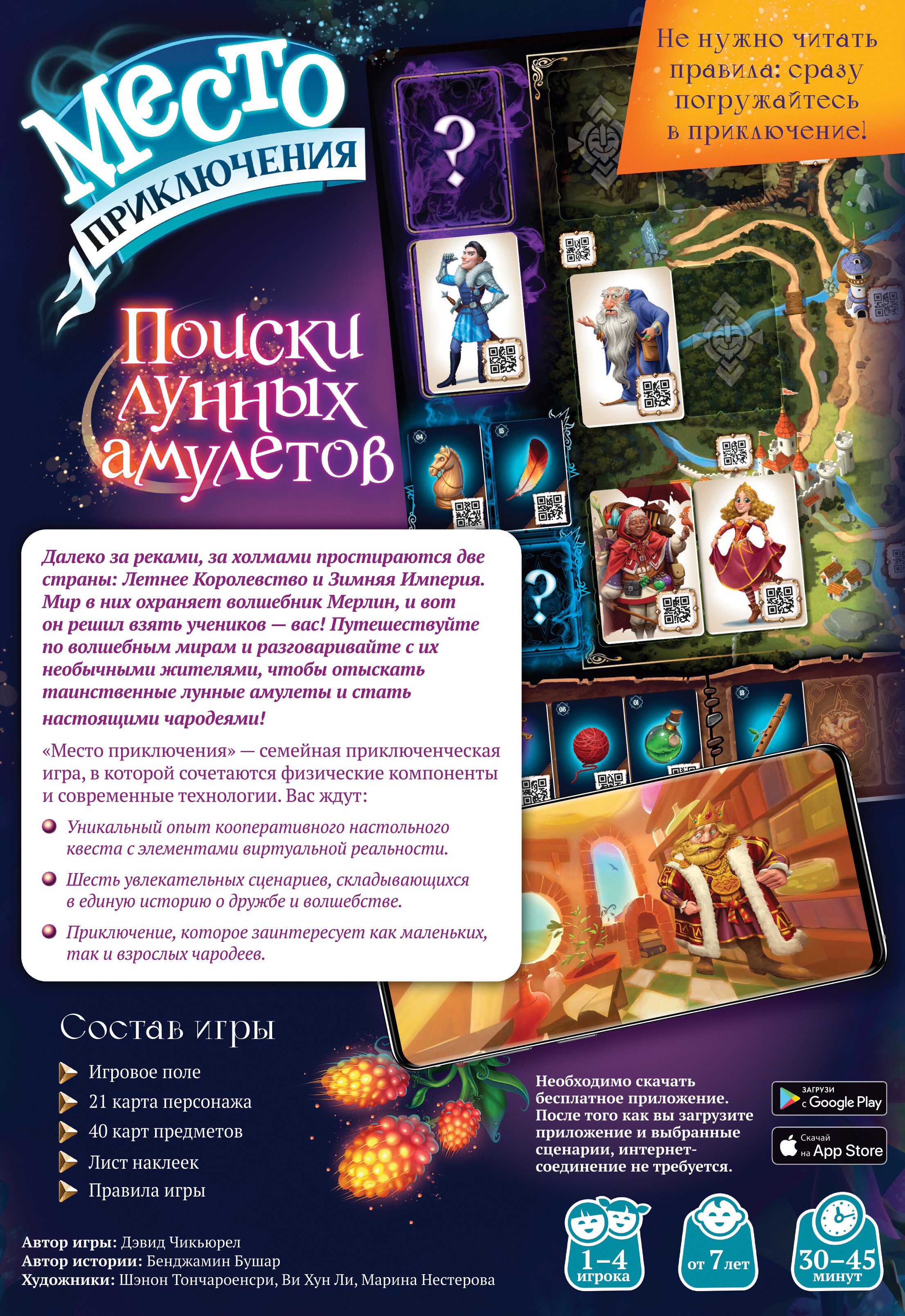 В данном настольном приключении игроки отправятся на поиски четырех лунных камней, для получения которых вам предстоит преодолеть множество загадок и разгадать немало тайн. Ключевой особенностью игры станет использование бесплатного мобильного приложения, в котором участникам будут доступны подсказки и различные сцены из игры. Соберитесь вместе за одним столом, помогайте друг другу и найдите ответы на все вопросы, путешествуя по красочному миру сказочного королевства!