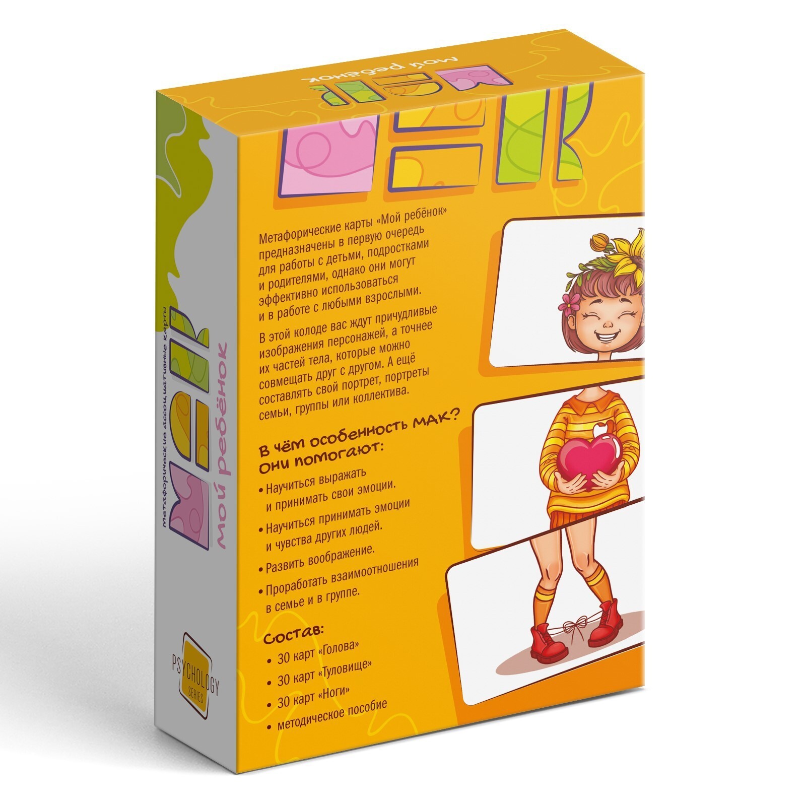 Метафорические карты содержат различные изображения, которые по ассоциациям и образам помогут вам понять, что вас беспокоит и как это исправить. В коробке вас ждут девяносто карт для проработки взаимоотношений в семье и в разборе собственных чувств и ощущений.