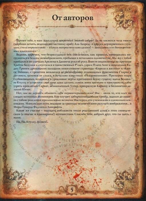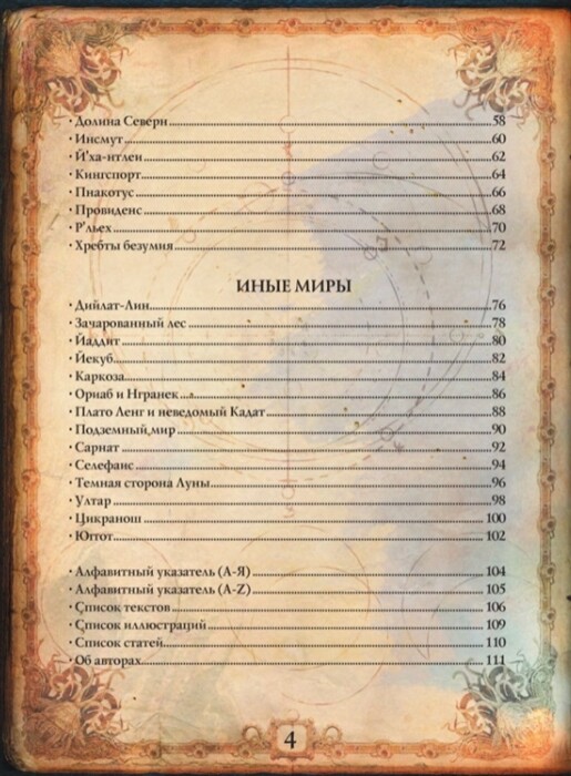 В этой книге, являющей собой подробный, богато иллюстрированный альбом-справочник, писатели, редакторы, художники и специалисты по творчеству Лавкрафта и его последователей рассказывают и показывают локации и артефакты, иные миры и запретные труды, составляющие значимую часть "вселенной Лавкрафта" и так называемых Мифов Ктулху.