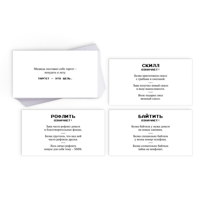На каждой карте данной викторины вы найдете современные слова молодежного слэнга. Под каждым таким словом будет три варианта его возможного значения, а на обратной стороне карты указан правильный вариант. Вытянувший карту игроки читает слово и три значения, после чего остальным участникам нужно угадать, какой вариант верный. У кого это получится, тот станет на шаг ближе к победе. Кто сможет отгадать большинство слов, тот и станет победителем!