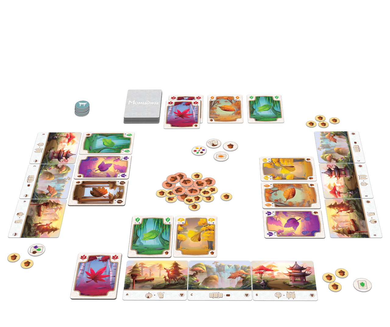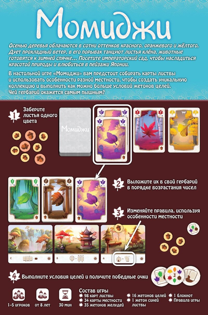 В данной красочной настольной игре вас ждет карточное противостояние на сбор лучшего гербария. Собирая опавшую листву, участники смогут формировать ряды листьев и приобретать различные цели, выполнение которых принесет больше призовых очков. Листья подразделяются на несколько типов, и каждый из них при расположении рядом обладает полезными свойствами. Выкладывая карты по определенным правилам вам предстоит набрать как можно больше очков за определенное количество ходов. Попробуйте свои силы в соревновательном и усложненном режиме, либо проверьте себя в одиночной игре. Соберите лучший гербарий в японском саду!