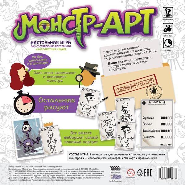 Данная игра-соревнование проверит ваши навыки художника и предложит компании игроков нарисовать определенного монстра за короткий промежуток времени. Один из участников смотрит на карты с монстрами и выбирает одного из них, запоминая его детали. Остальные игроки быстро спрашивают его о том, как монстр выглядел, и стараются нарисовать его максимально близко к изложенному тексту. Как только время выйдет, карта будет перевернута, и игроки должны будут выбрать, у кого получился самый похожий монстр. Участник, который выигрывал чаще остальных, станет победителем!