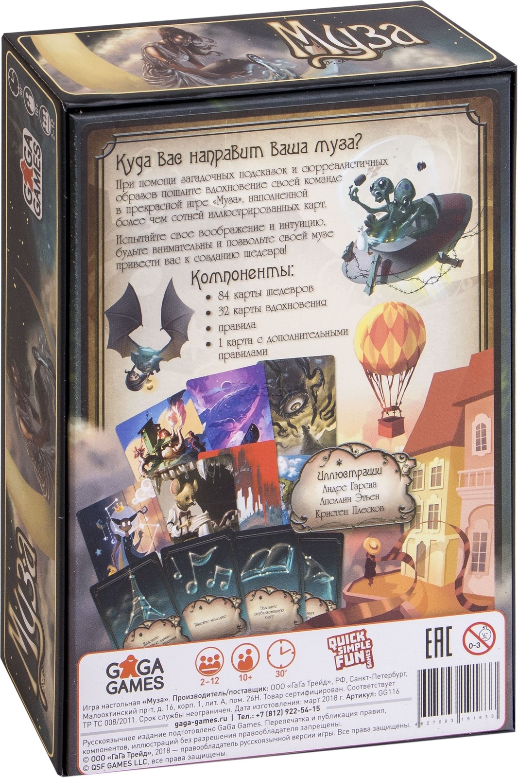 Все мы знаем, что вдохновение вещь крайне капризная и непостоянная. Бывает, ждешь несколько дней, стараясь придумать что-то, но нет идей, как ни крути. И вдруг, когда совсем не ожидаешь, тебя посещает муза. В данной настольной игре для большой компании предстоит угадывать загаданную карту с яркими и абстрактными иллюстрациями. Используя подсказки, игрок в роли музы направляет остальных участников на путь вдохновения. Слушайте подсказки внимательно, смотрите на необычные образы, и пусть вам откроется настоящий шедевр искусства! Придет ли к вам муза и одарит ли вас вдохновением?