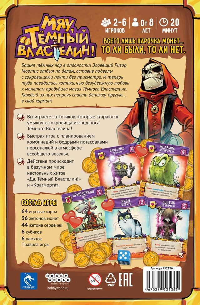 64 игровые карты36 жетонов монет44 жетона сердечек6 кубиков6 памятокПравила игрыРазмер карт: 63x88 мм (70 шт.)