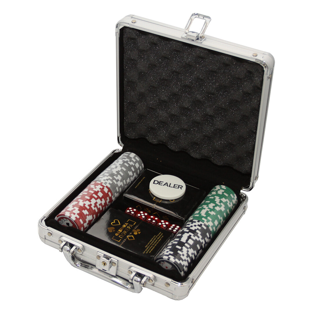 Данный набор содержит 100 пластиковых фишек с разным номиналом, две колоды на 55 карт из плотного картона и пластиковую дилерскую фишку. Все это упаковано в удобный алюминиевый кейс, который вы можете взять с собой куда угодно.