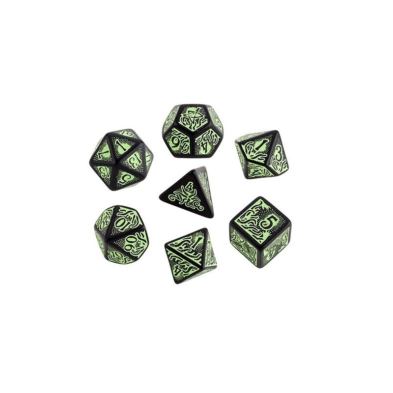 Данный набор кубиков с разными гранями подойдет для любых настольных ролевых приключений. Выполненный в черном цвете с зелеными узорами, олицетворяющими щупальца, набор поможет решить любые ситуации за столом и станет верным компаньоном для игроков!