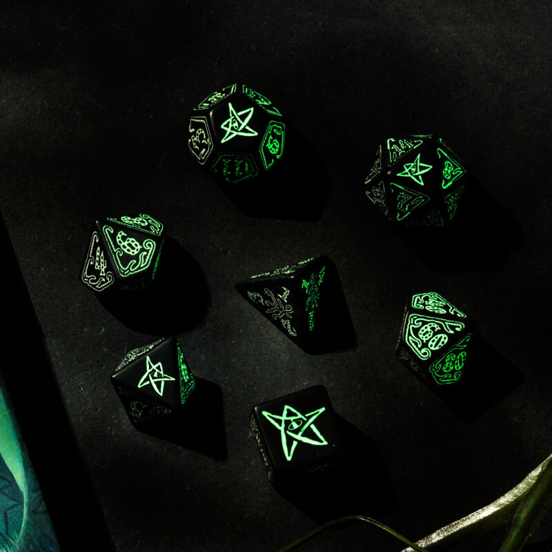 Данный набор кубиков с разными гранями подойдет для любых настольных ролевых приключений. Выполненный в черном цвете с зелеными узорами, олицетворяющими щупальца, набор поможет решить любые ситуации за столом и станет верным компаньоном для игроков!