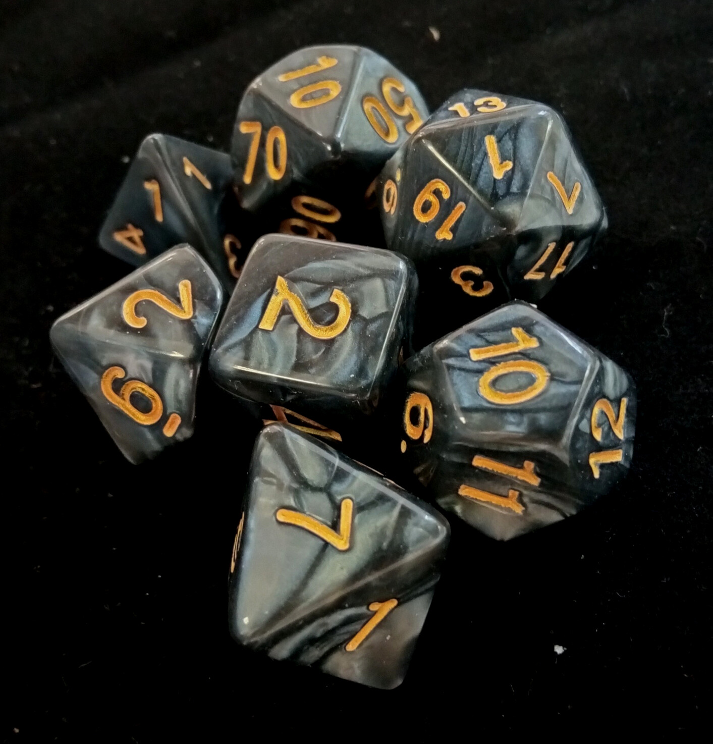 Перед вами неотъемлемая часть словесных ролевых приключений - семь разногранных кубиков. Они станут вашими верными компаньонами в далеких странствиях и опасных сражениях. Данные кубики изготовлены из прочного пластика темного цвета с перламутровой структурой.