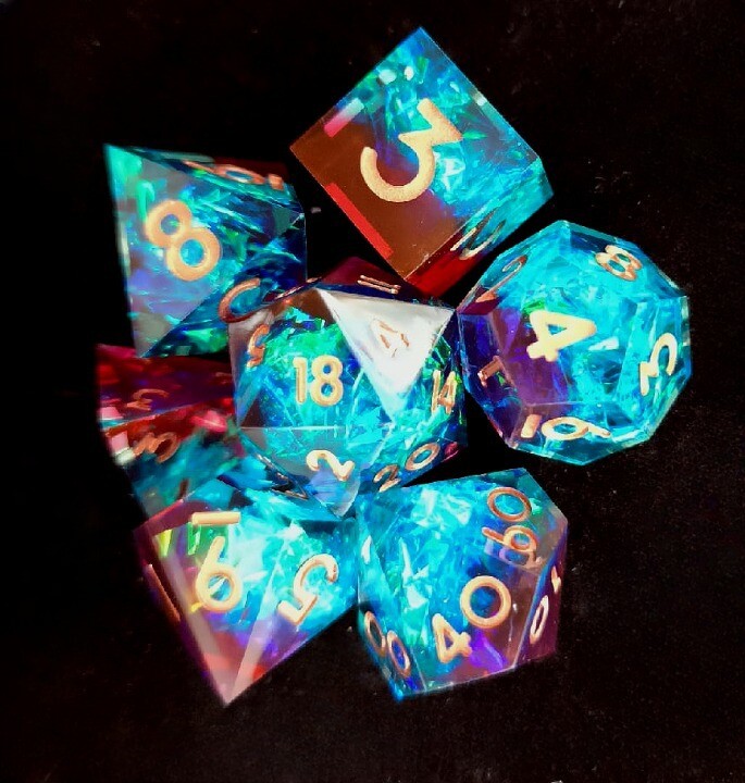 Набор кубиков для RPG 7 шт. прозрачные голубой с красным с фольгой (острые грани)