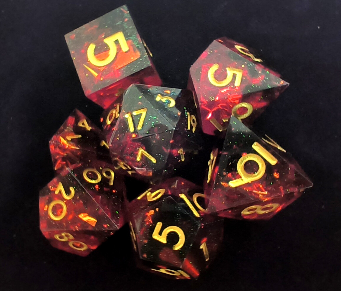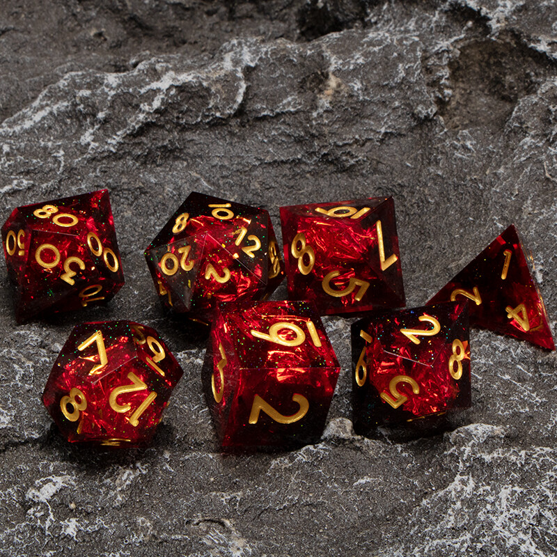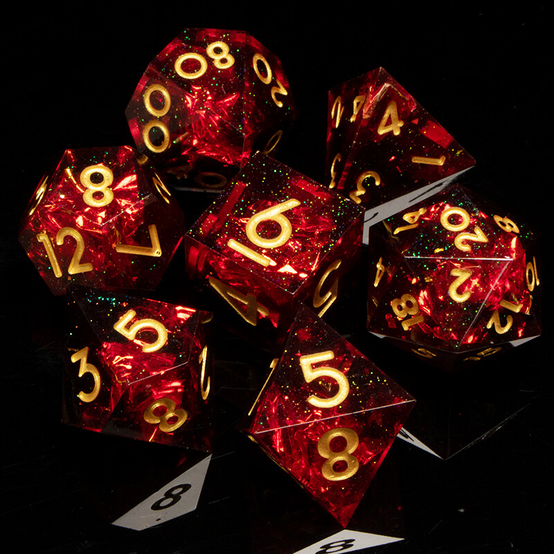 Набор кубиков для RPG 7 шт. прозрачные красные с фольгой (острые грани)