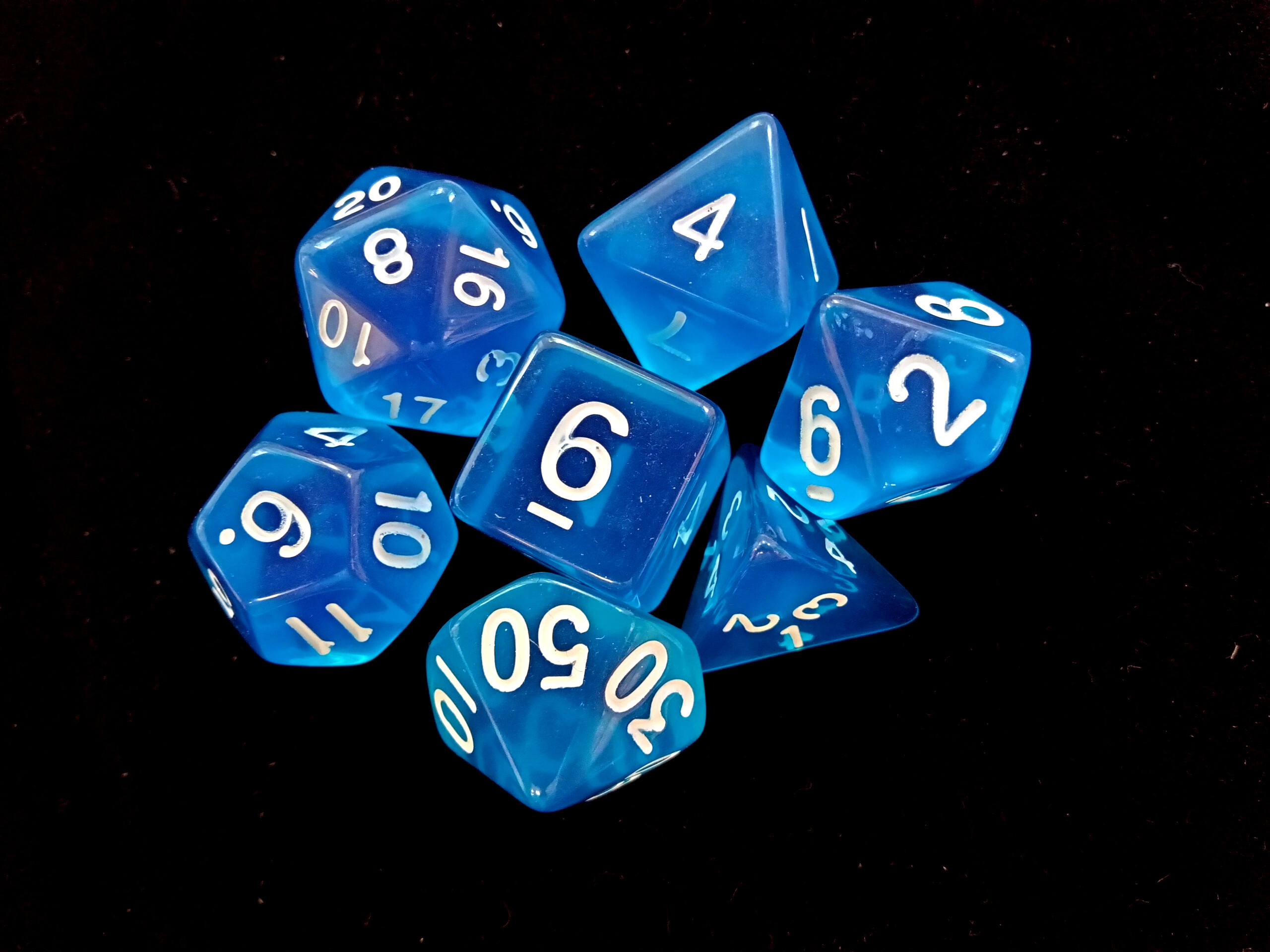 Набор из семи кубиков разных граней весьма универсален и подойдет для множества настольных ролевых игр. Данный вариант изготовлен из прочного прозрачного пластика, и имеет голубой цвет.