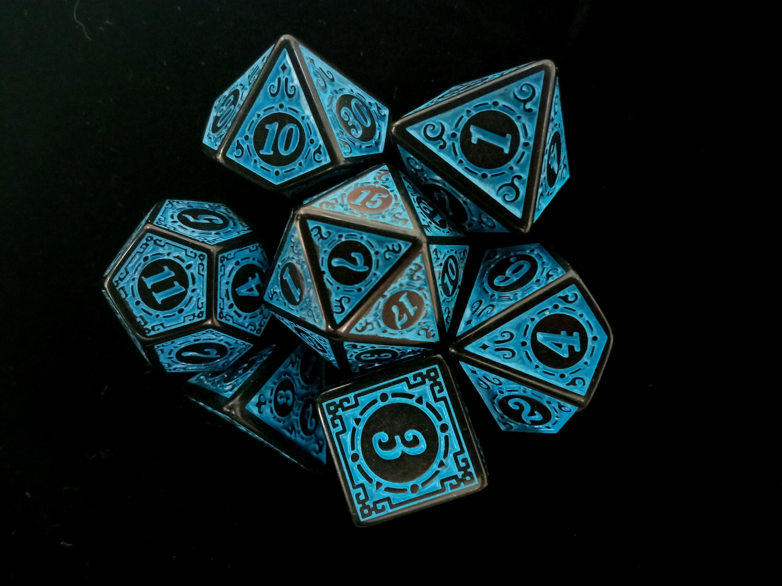 Набор кубиков для RPG 7 шт. с объемным рисунком Черные с голубым