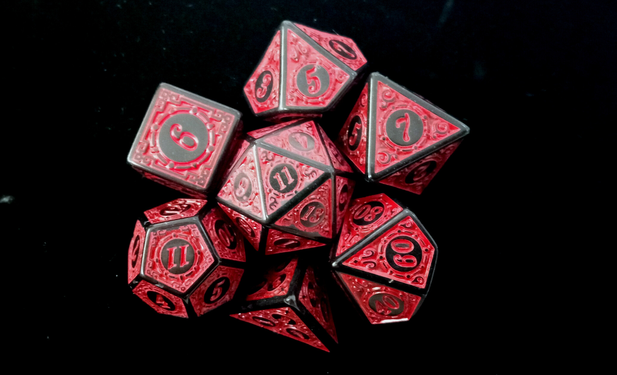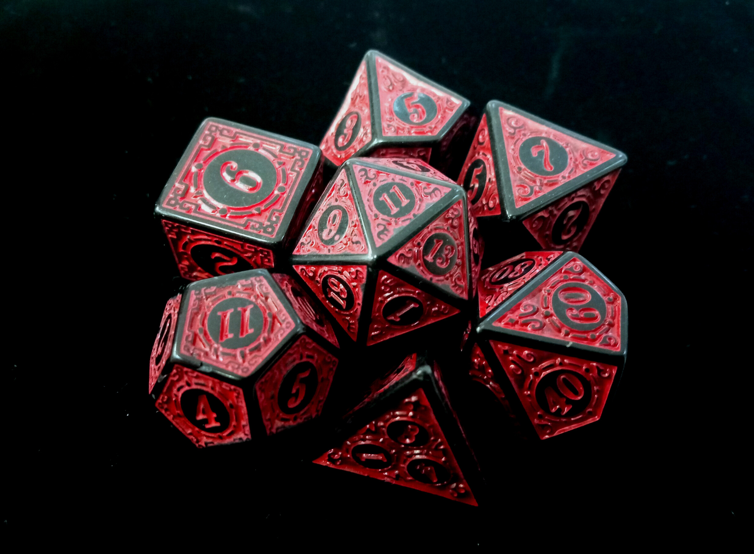 Набор из семи игральных костей с разными гранями весьма универсален и предназначен для настольных ролевых игр. Кубики из данного набора имеют рельефную текстуру и эффектное оформление.