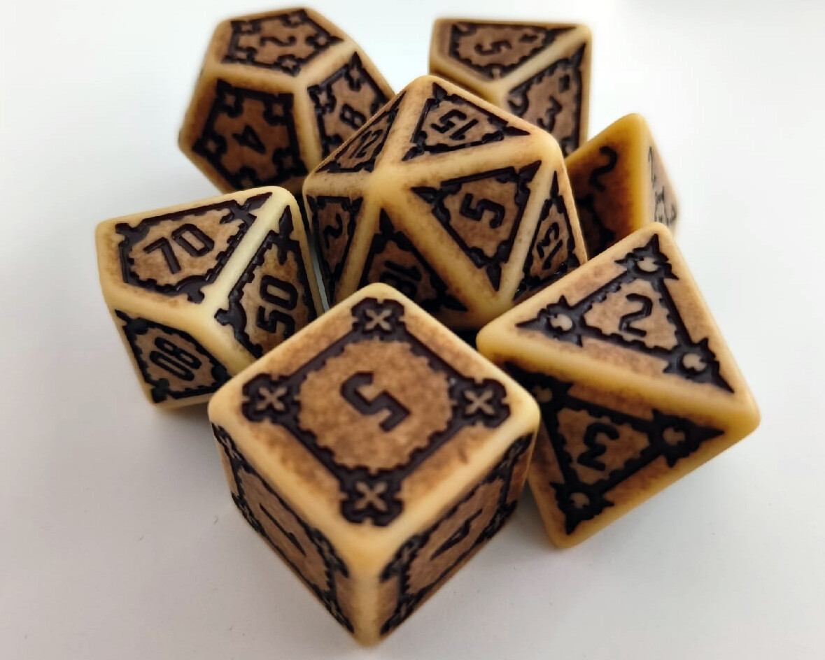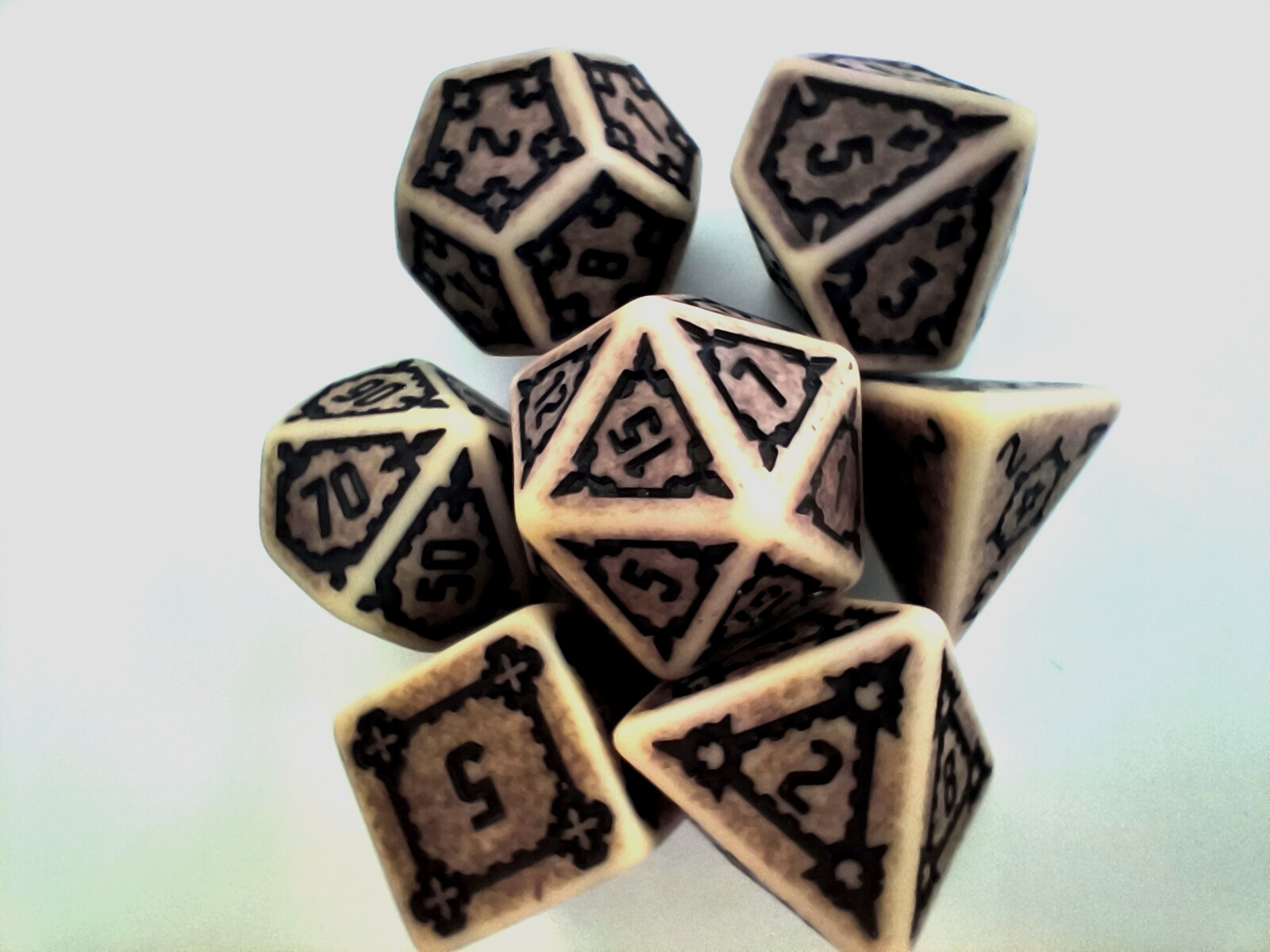 Кубики увеличенного размера качественно расписаны под слоновую кость и подходят для огромного количества настольных ролевых приключений. В наборе вы найдете семь кубиков с разным количеством граней.