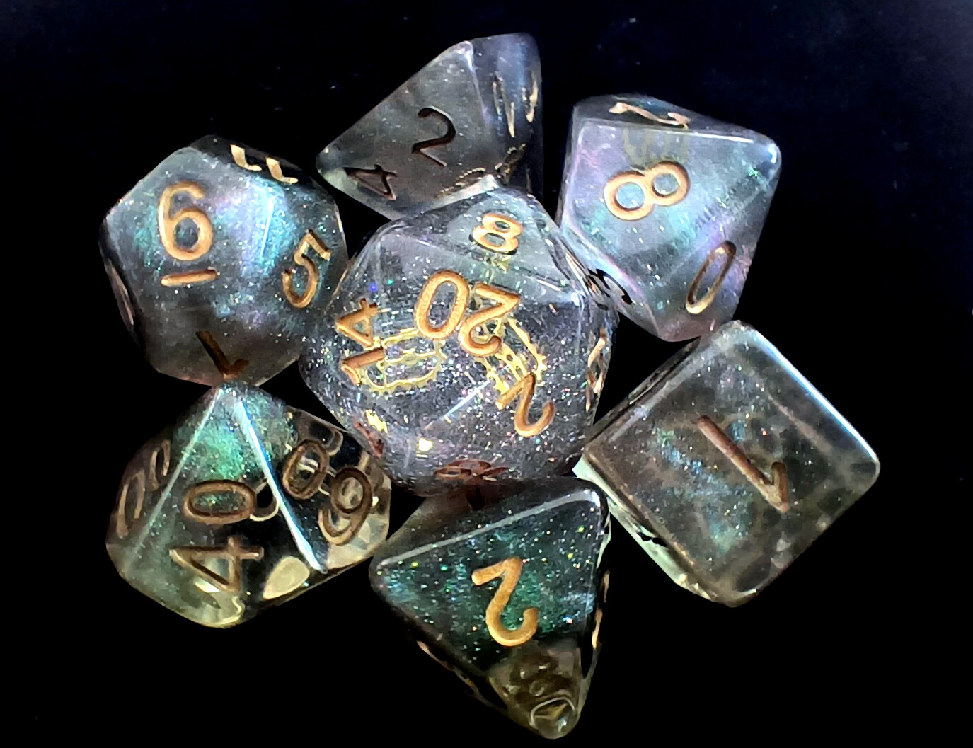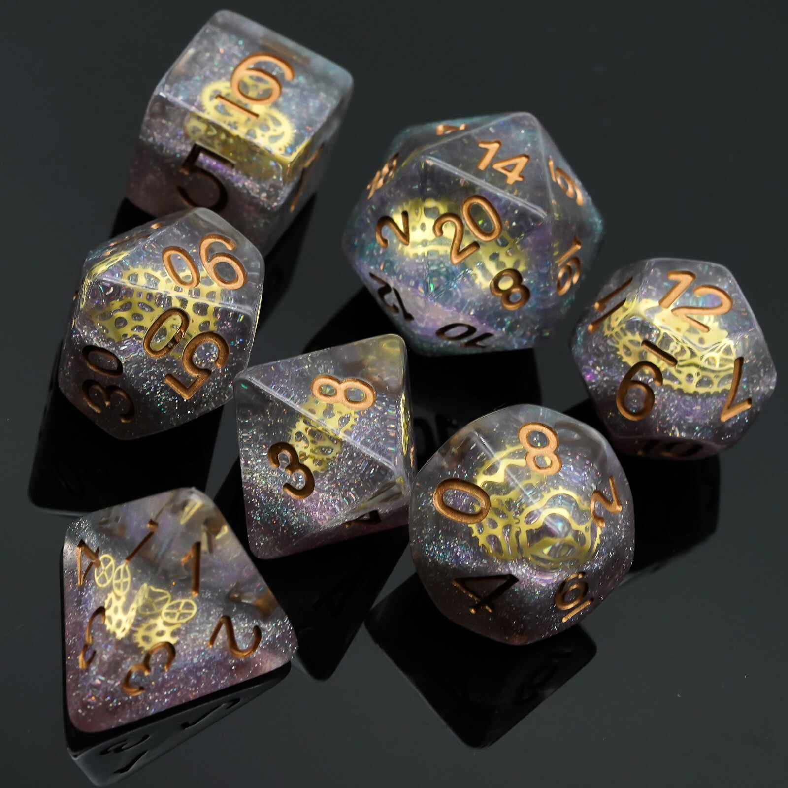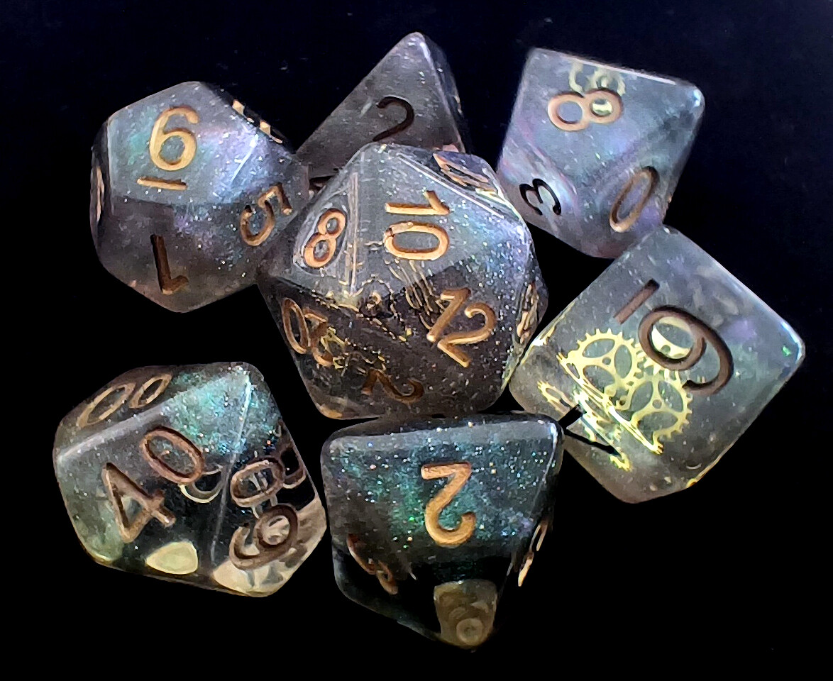 Набор кубиков для RPG 7 шт "Стимпанк" прозрачные золотисто-зеленые
