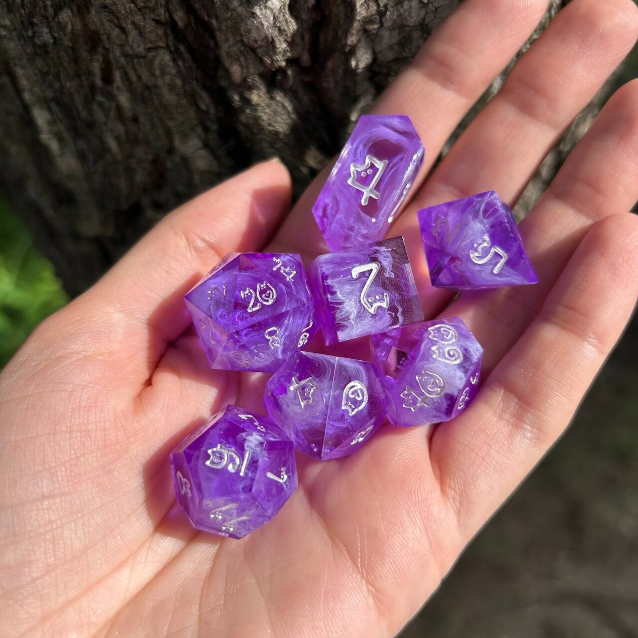 Красочный фиолетовый набор кубиков поставляется в количестве семи штук. Игральные кости изготовлены вручную и подойдут для множества различных настольных ролевых игр. Каждый из кубиков отличается друг от друга по количеству граней, а весь набор поможет вам в принятии нелегких решений за игровым столом.