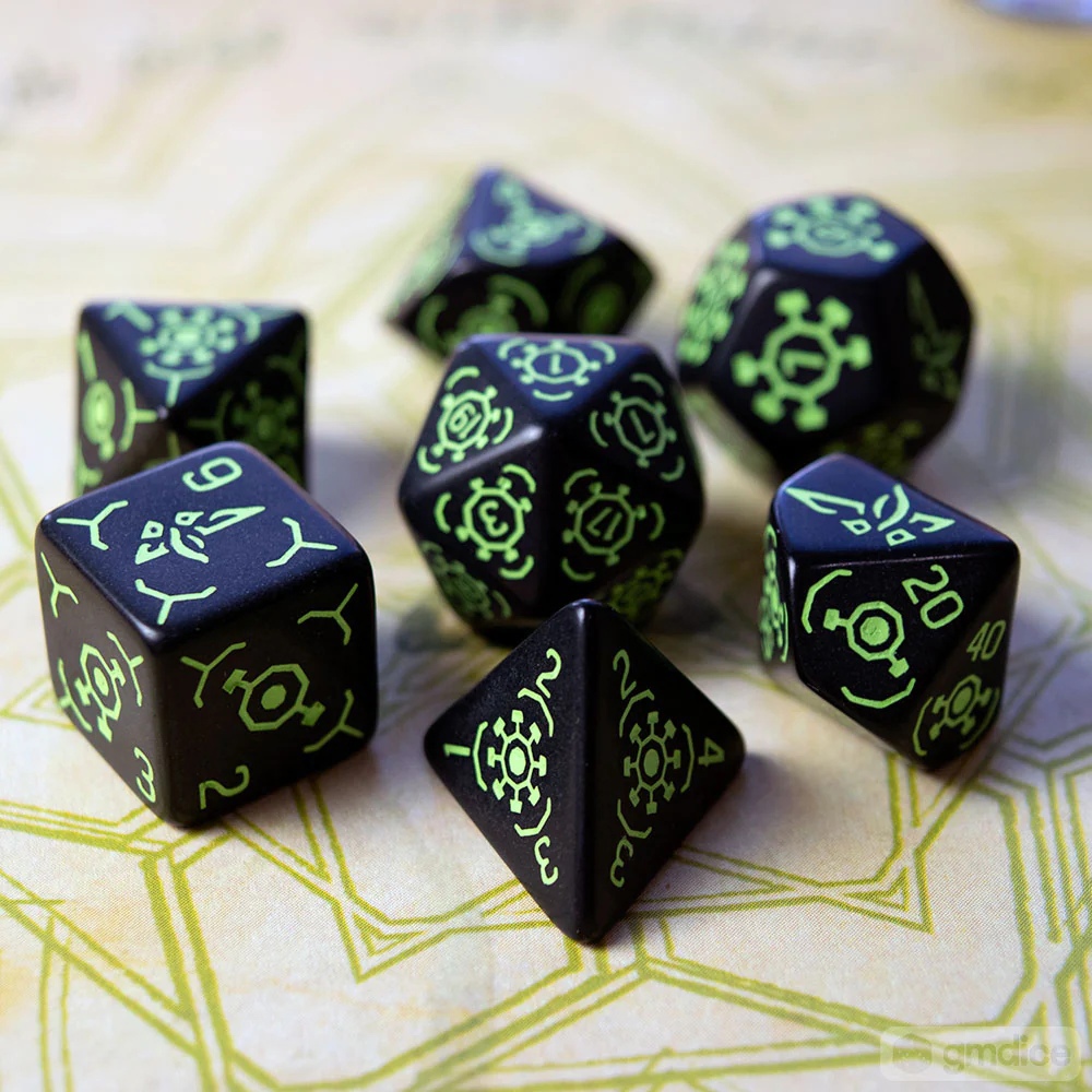 Набор игральных кубиков содержит семь костей из прочного пластика с разным количеством граней. Данный набор подходит для множества настольных игр и развлечений, а визуал кубиков основан на популярной ролевой вселенной.