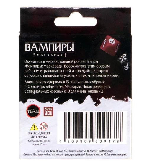 Настоящая легенда настольных игр возвращается! Станьте вампиром, борющимся за выживание, выберите себе предысторию, познакомьтесь со множеством запоминающихся персонажей и пройдите увлекательное приключение, исход которого зависит только от вас. В коробке вы найдете книгу правил, красочно оформленных и самых актуальных на сегодняшний день. Благодаря данному изданию вы сможете узнать более подробные истории персонажей, а также ознакомиться с долгой историей игрового мира. Пятая редакция с большим уважением относится к своему первоисточнику, а также продолжает основной сюжет, поэтому будет интересна как новичкам, так и опытным игрокам. Примерьте на себя личину вампира из высшего общества, или станьте изгоем, живущим в канализации и утратившим человеческий облик, боритесь с жаждой крови, или станьте ненасытным кровопийцей, - выберите свой путь в этой увлекательной игре, пользующейся почетом уже не один десяток лет.
