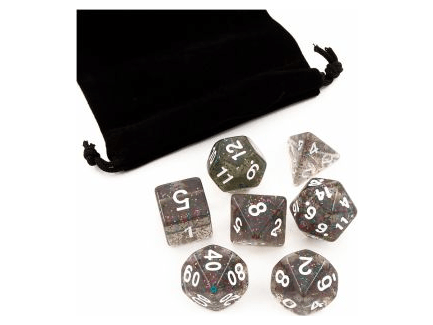 Набор игральных кубиков имеет приятный внешний вид и завораживающую текстуру блестящего серого цвета. Семь костей имеют разной количество граней и довольно универсальны. Они подойдут для множества настольных ролевых игр и станут вашими верными помощниками в любом увлекательном приключении.