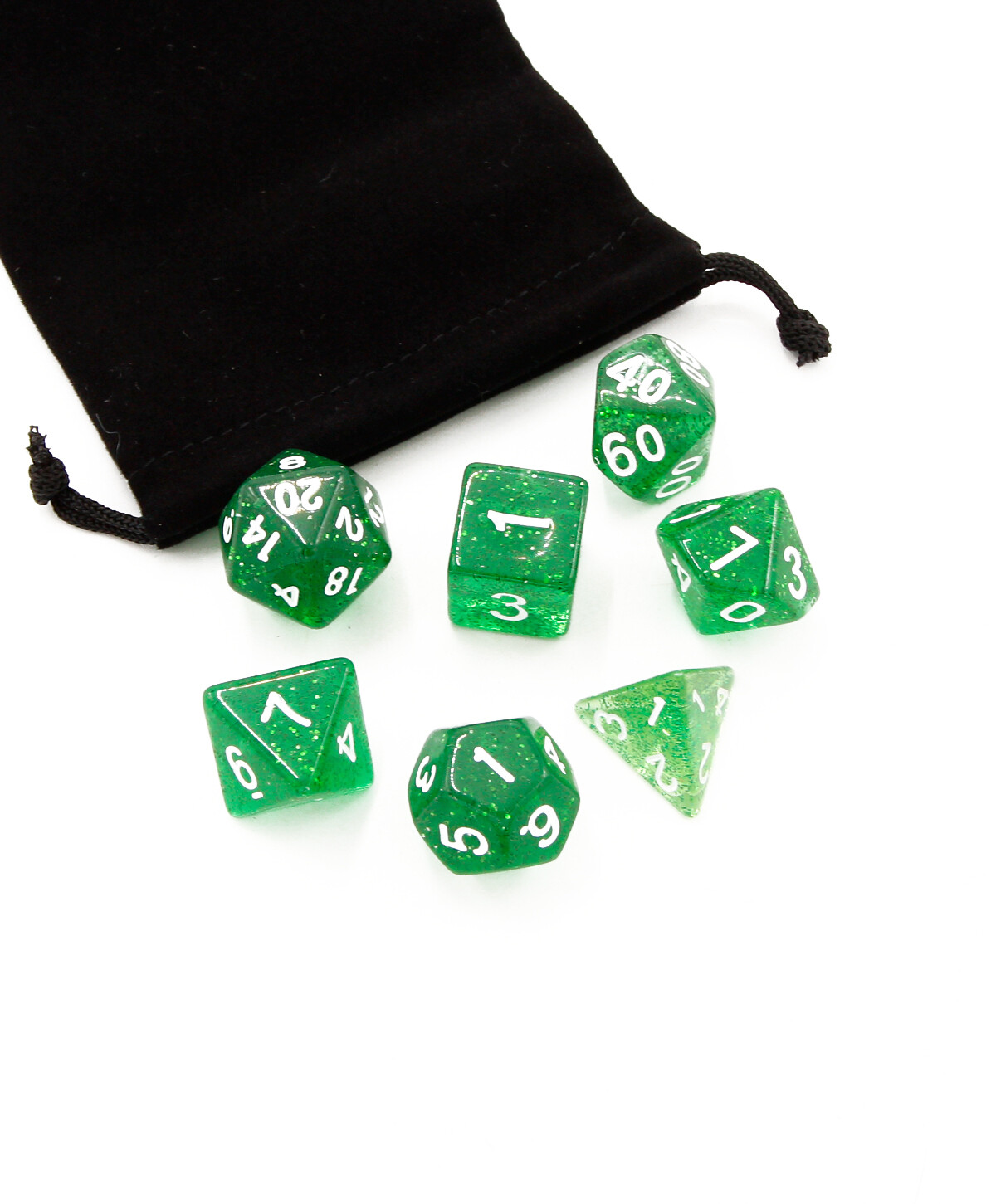 Набор из семи игральных кубиков разработан для различных ролевых настольных игр и довольно универсален. В упаковке вы найдете семь костей, имеющих разное количество граней и чисел. Кубики изготовлены из пластика и имеют чарующий внешний вид - зеленые блестки наполняют прозрачную структуру каждой игральной кости.