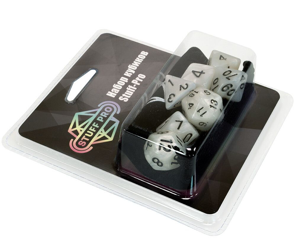 В наборе каждый кубик не похож друг на друга. Такие наборы используются для словесных ролевых игр. Семь игральных костей изготовлены из прочного пластика белого цвета с черными цифрами.