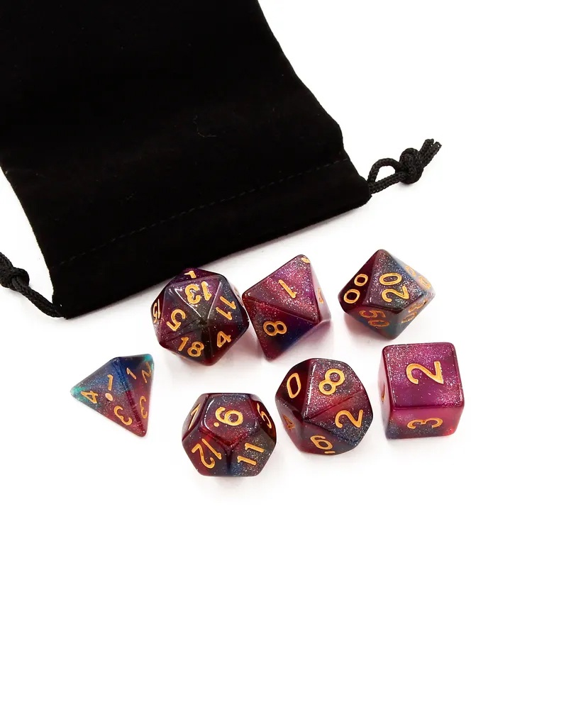 Набор кубиков состоит из 7 различных кубиков из пластика – D4, D6, D8, D10, D12, D20, D100 - каждый кубик диаметром 16мм. Набор кубиков надежно упакован в крепкую и прочную коробочку из прозрачного пластика, которая защитит кубики от падения или царапин.