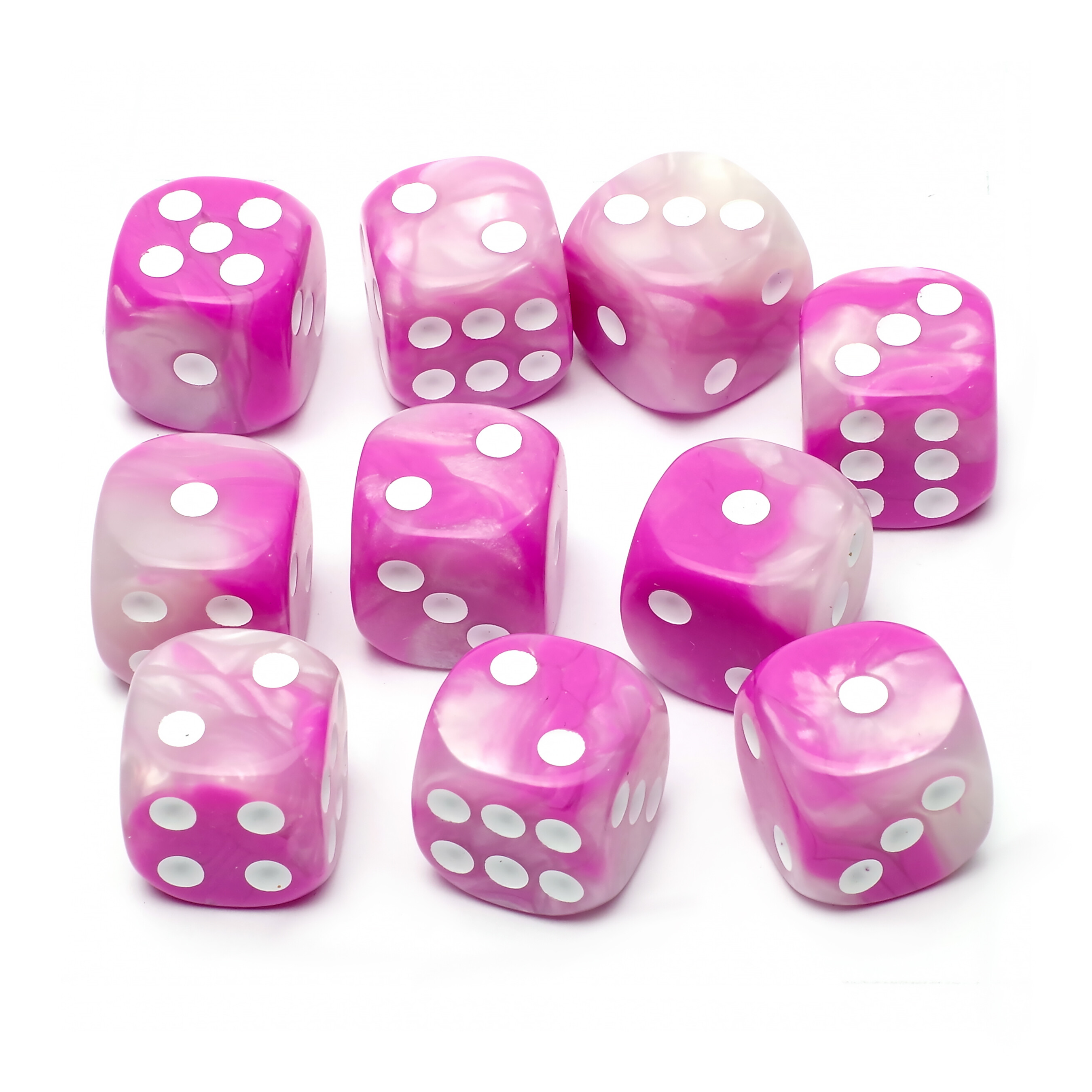 Набор из десяти кубиков с одинаковым количеством граней совершенно универсален и подойдет для множества настольных игр и развлечений. Шестигранные игральные кости изготовлены из прочного пластика и представлены в бело-розовых цветах.