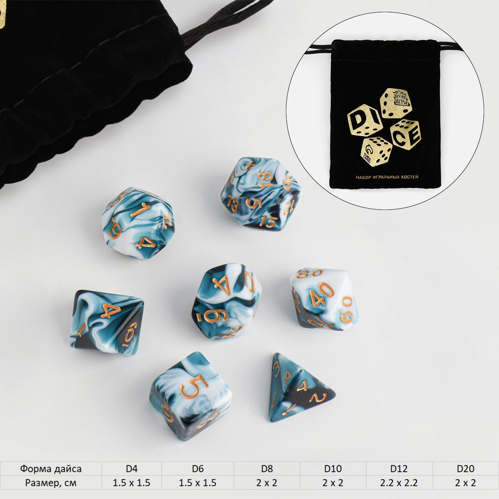 Данный набор кубиков универсален и подойдет для настольных ролевых игр. Семь игральных костей в упаковке обладают разным количеством граней и числовых значений. Кубики изготовлены из прочного пластика, имеющего мраморную текстуру.