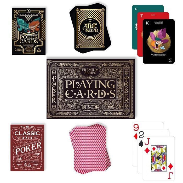 Данный набором станет отличным подарком для всех любителей карточных игр. В красочной упаковке вас ждут две колоды, в каждой из которых будет по пятьдесят четыре карты. Таким образом, колоды подходят для покера, но легко могут использоваться практически в любом карточном развлечении. Одна из колод оформлена в классическом стиле, а другая выполнена в тематике "Алисы в стране Чудес".