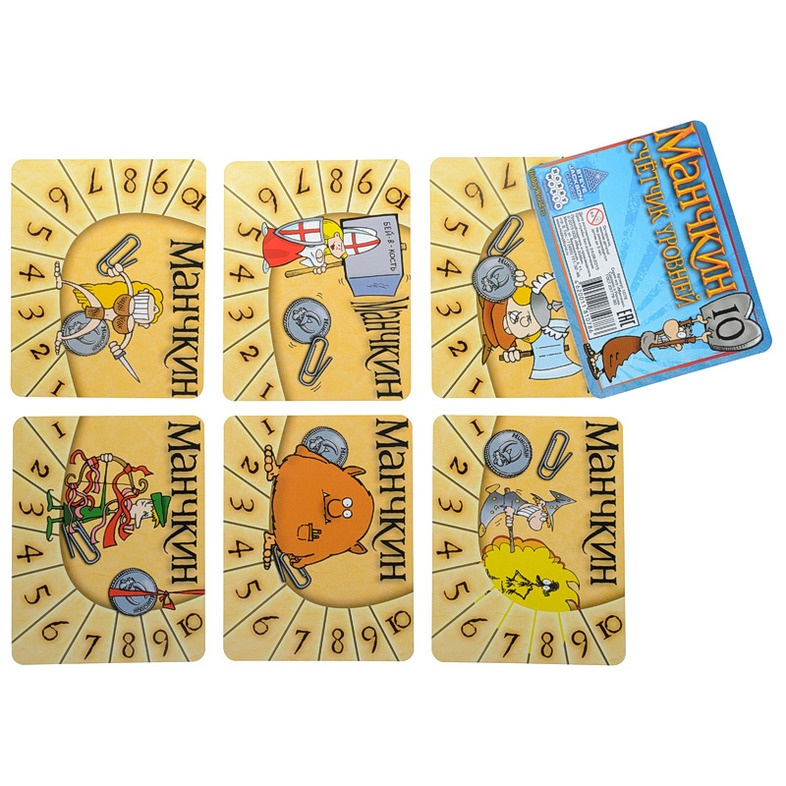 - «Манчкин: Счетчик уровней» – удобный и простой способ следить за своим уровнем. Отличная замена, вечно теряющимся, спичкам, монетам и пуговицам.