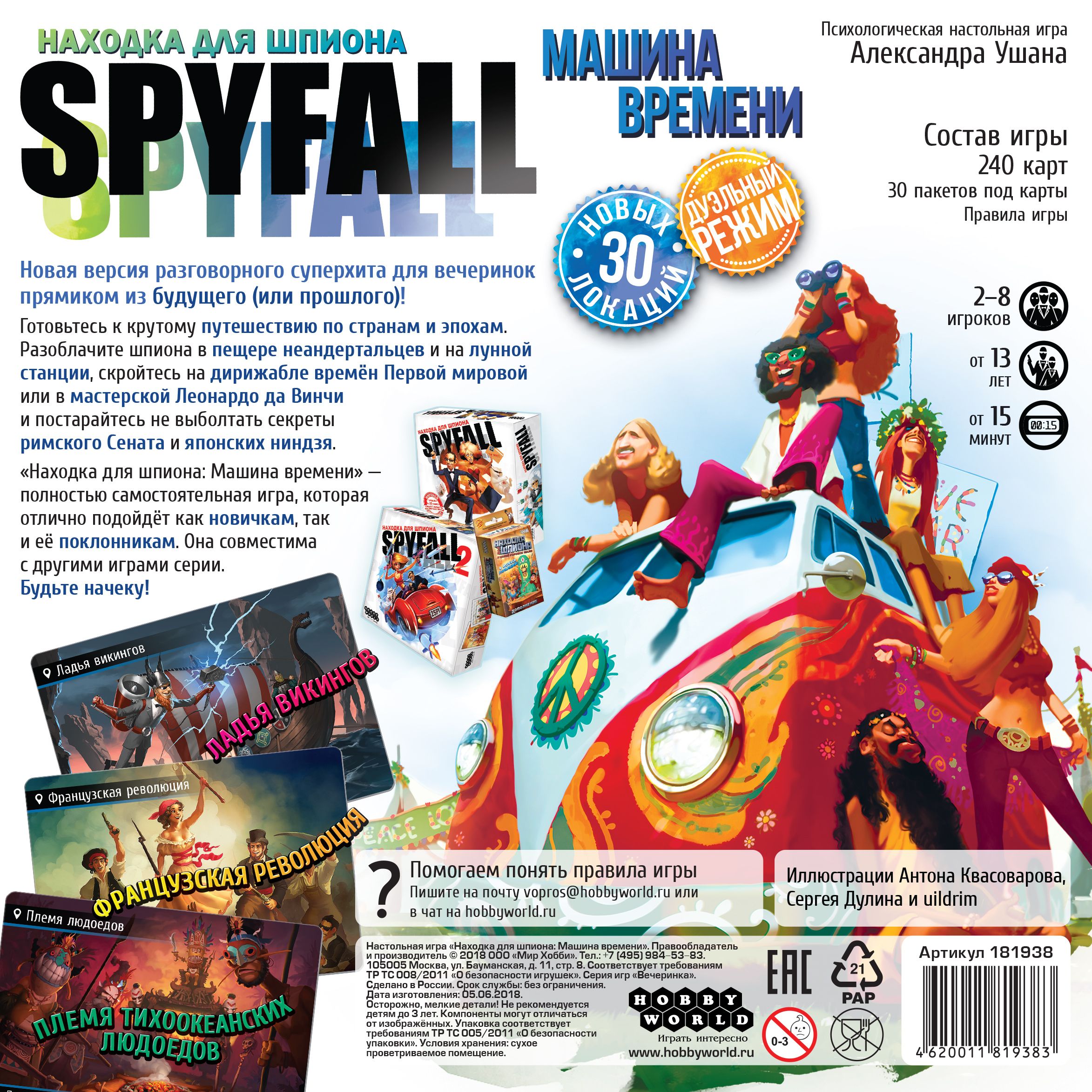 Поиски шпиона по всему свету! Найти агента под прикрытием - задача не из легких. Он может быть где угодно, скрываясь в толпе и запутывая преследователей. С данным вариантом знаменитой игры участники смогут отправиться в локации различных временных эпох - от королевских замков до золотодобывающих шахт Дикого Запада. Каждый получит на руки карты с одинаковой локацией, но одному достанется карта шпиона. После чего начнется проверка вашей интуиции и проницательности, ведь игрокам нужно вычислить скрывающегося среди них. Задавая друг другу завуалированные вопросы по локации, они пытаются понять, кто агент, а шпион, в свою очередь должен догадаться, где он находится. Кто кого опередит? Данный набор содержит правила для двоих игроков, командный вариант, а также может быть соединен с любым другим вариантом знаменитой разговорной игры.