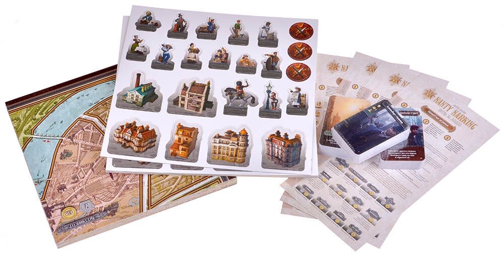 Окунитесь с головой в атмосферу Лондона конца 19-го века и победите своих соперников! Данное красочное противостояние предложит игрокам сразиться за контроль над территориями, возводя здания на игровом поле, представляющим собой территорию Лондона. Каждый из участников имеет с самого начала тайную цель, выполнение которой сразу принесет победу. Несмотря на стратегическую составляющую, основной упор в игре сделан на розыгрыш карт. Каждая из них уникальна, великолепно оформлена и содержит одно или несколько действий, которые предстоит выполнить игроку. Это может принести ему новые карты, дать неслабое преимущество и заставить противников сильно понервничать. Главное, - успеть раньше остальных достичь своей тайной цели. Встретьтесь со множеством знаменитых литературных персонажей, реальных исторических личностей и простых трудяг на улицах знаменитого города. Сможете ли вы одержать верх и стать победителем? Карты на стол!