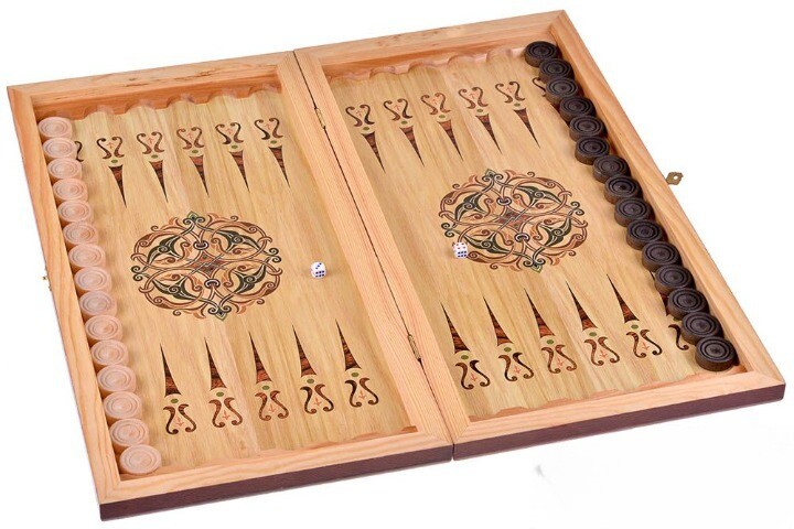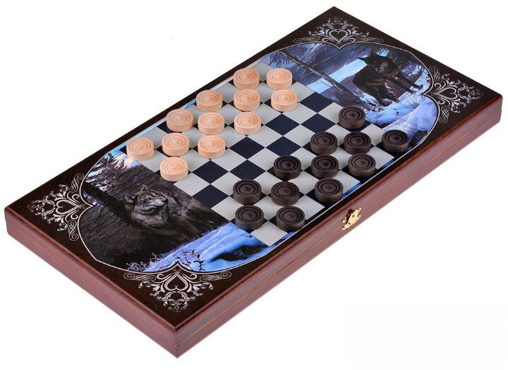 Красочный набор содержит все необходимое для игры в знаменитые нарды. На коробке нанесено изображение волков в снежной глуши. В разложенном состоянии размер поля составляет 500x250мм.