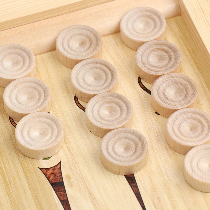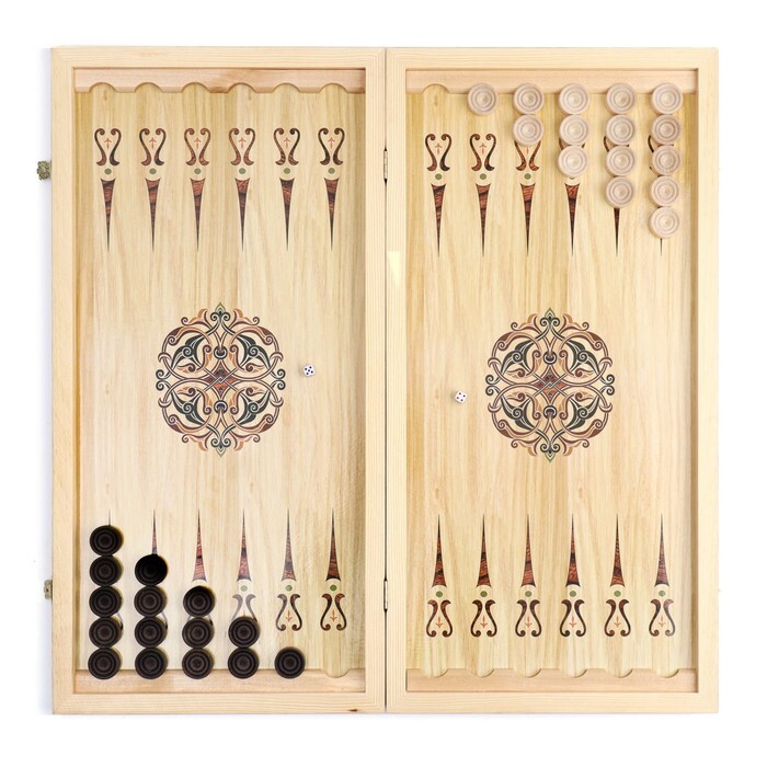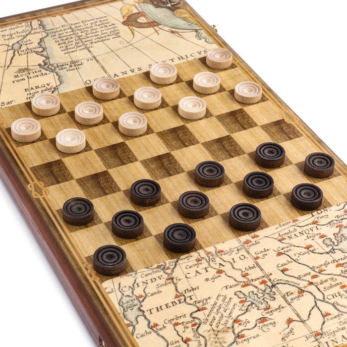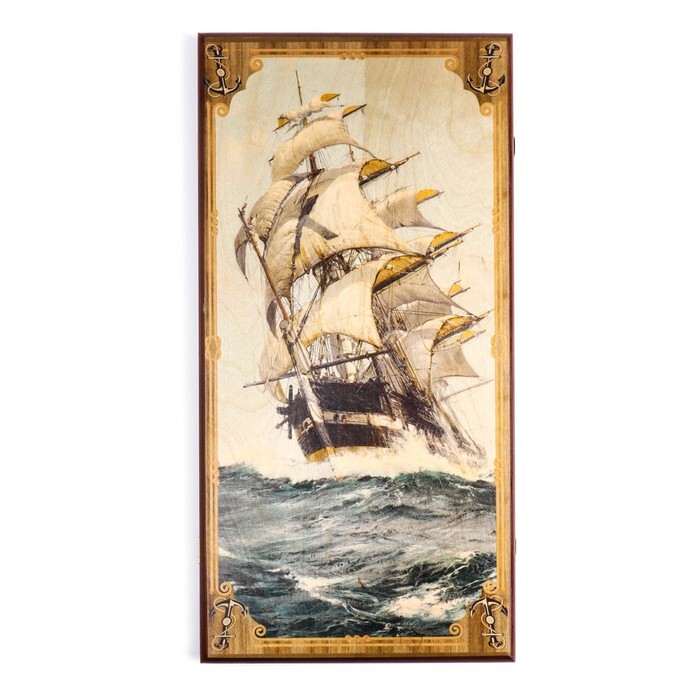 Легендарные нарды подойдут для игроков разных возрастов и станут хорошей тренировкой логического мышления. Данный вариант имеет иллюстрацию роскошного фрегата на внешней части и разметку для игры в шашки, а размер игрового поля в разложенном состоянии составляет 600x600мм.