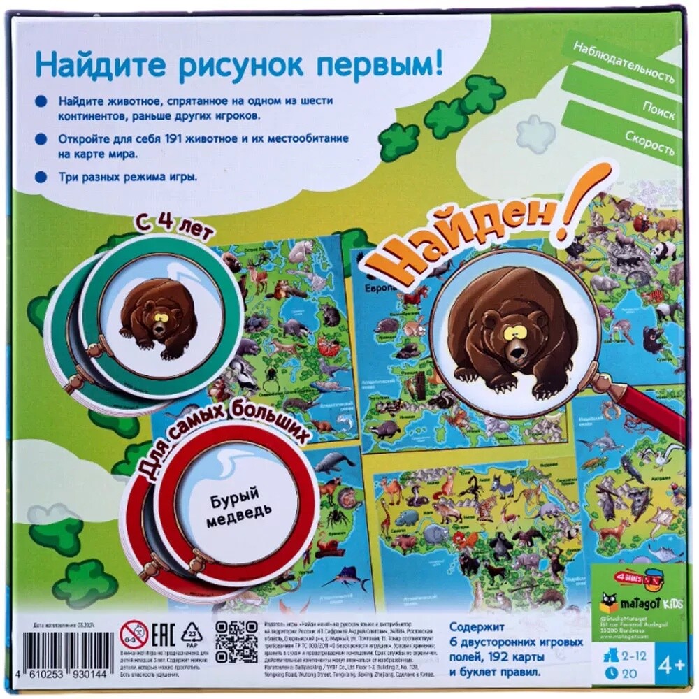 Проверьте свою внимательность! В данном соревновании вас ждет множество красочных иллюстраций различных животных. Вы можете проверить свои силы в трех режимах, каждый из которых будет отличаться по сложности. Выложите несколько игровых полей с иллюстрациями, после чего откройте карту и посмотрите, что там за животное. Попробуйте найти такое же на игровых полях! Кто будет быстрее остальных, станет на шаг ближе к победе! Если вы хотите усложнения задачи, выложите все шесть игровых полей, главное, чтобы глаза не разбегались. А карты с рисунками замените на карты с названиями животных, чтобы было еще сложнее. Тот из участников, кто сможет набрать наибольшее количество призовых очков, станет победителем!