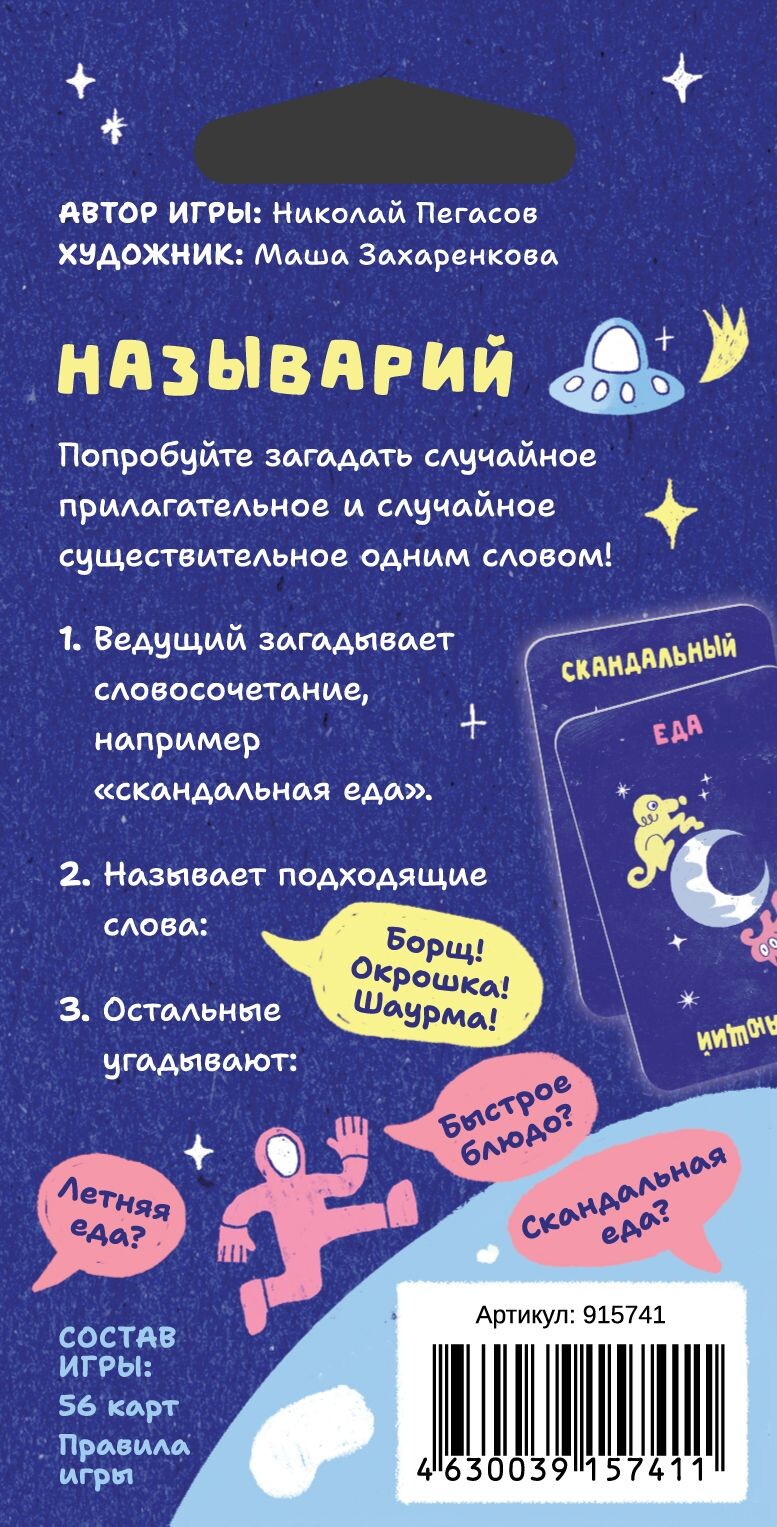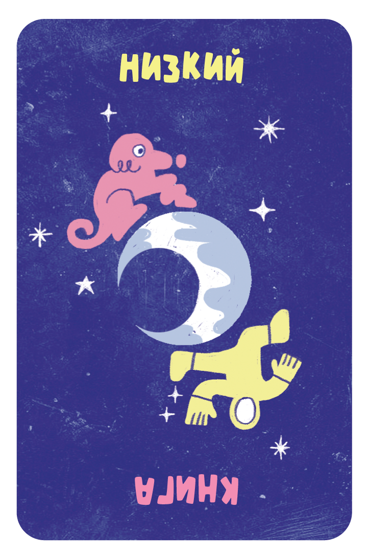 Попробуйте новое словесное соревнование! В небольшой коробке вас ждут карты, на каждой из которых будет одно существительное и одно прилагательное. Ведущий загадает участникам карту, придумав слово, которое объединяет оба понятия. Теперь вам осталось только понять, что же он имел ввиду. На размышление дается две минуты, не теряйте времени зря! Кто первым отгадает десять загаданных карт, станет победителем!